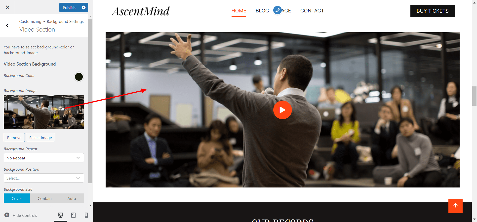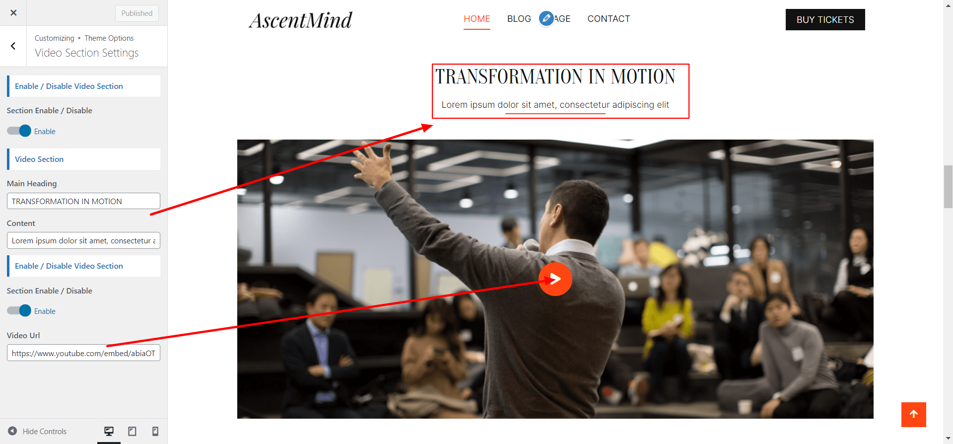 You can set sub heading , heading and content of section. You can choose from this options for each Video Section settings.