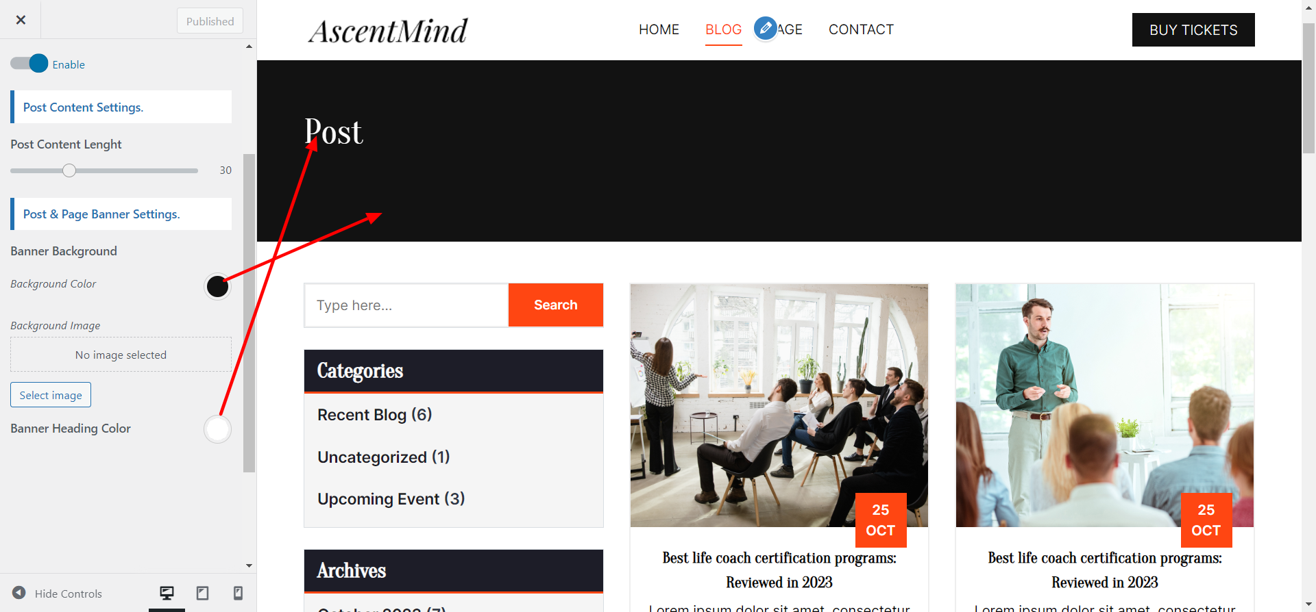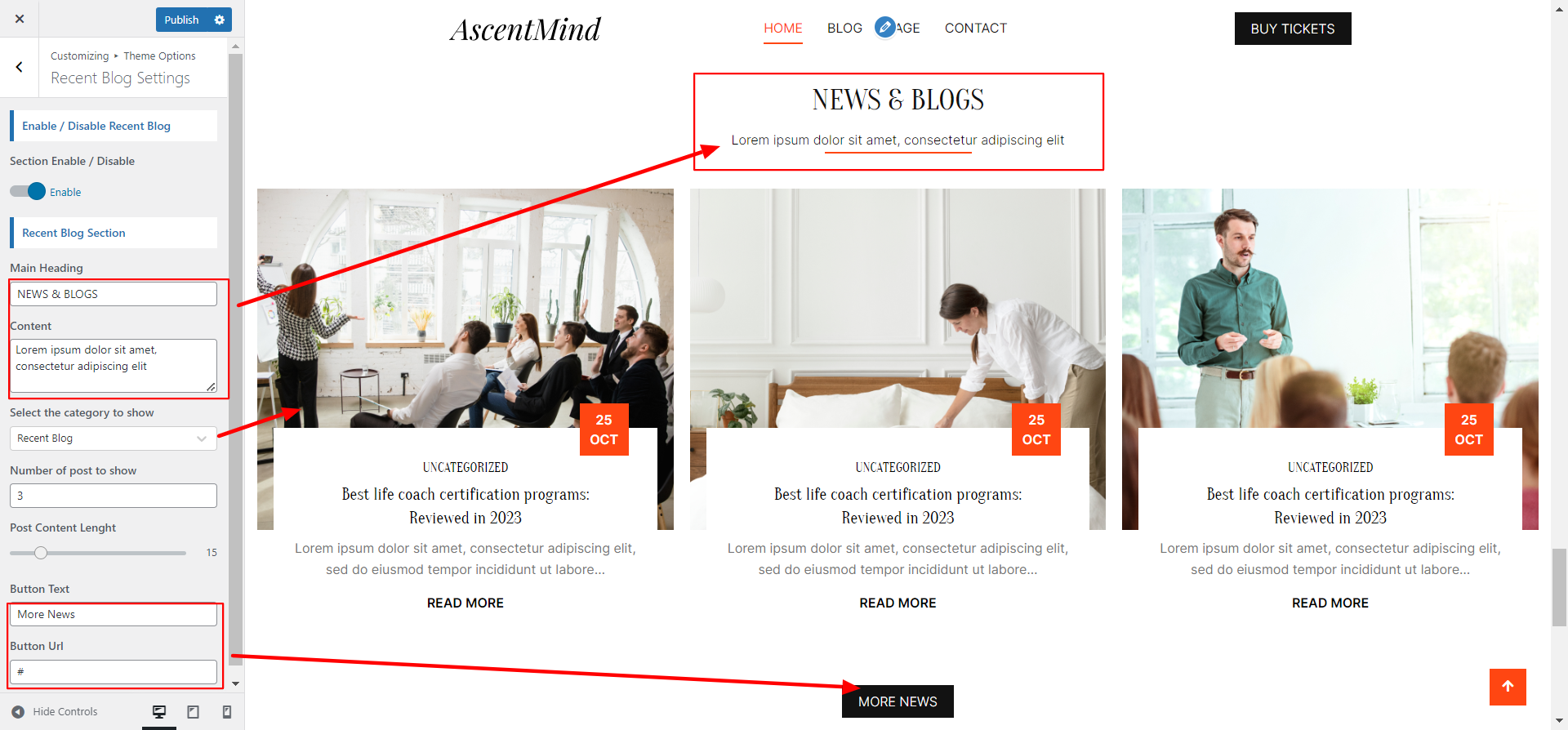 You can set heading and content of section. You can choose from this options in Recent Blog settings.