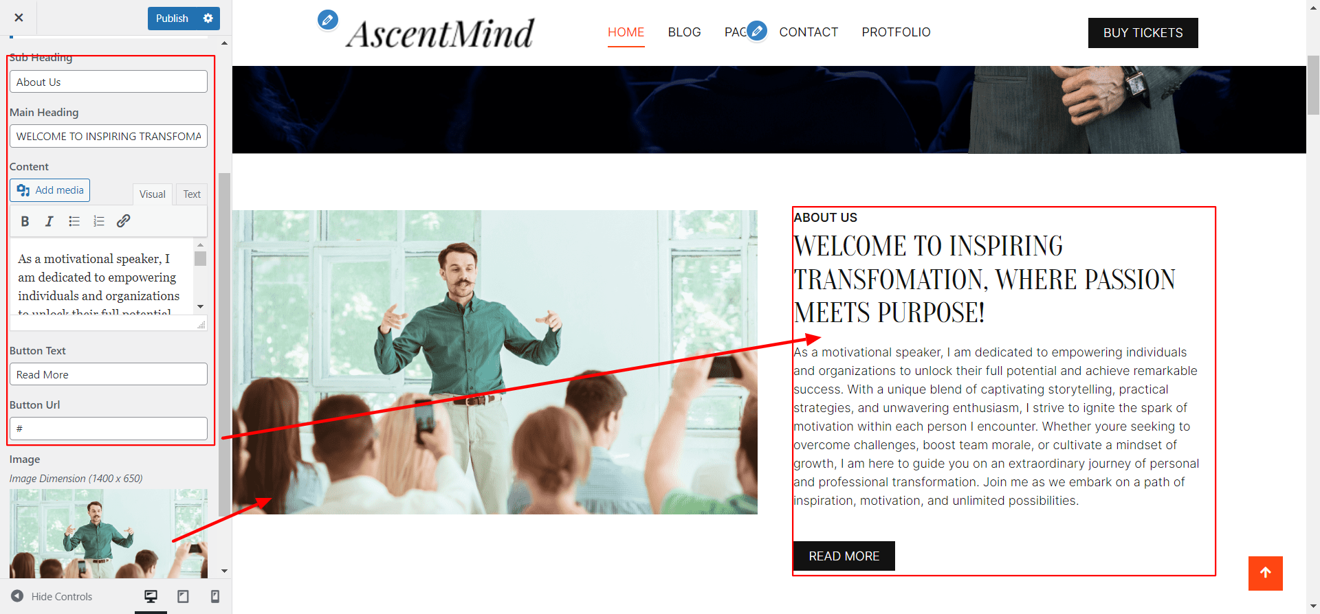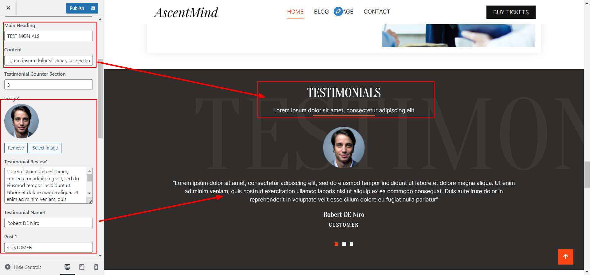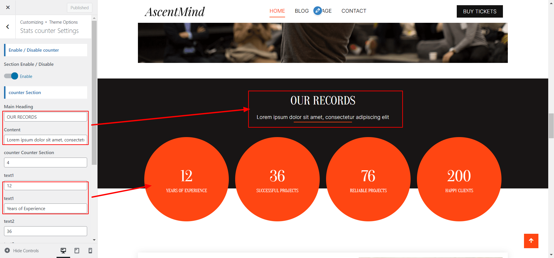 You can set sub heading, main heading and text for section. You can also set Counter Section the image for each testimonial settings