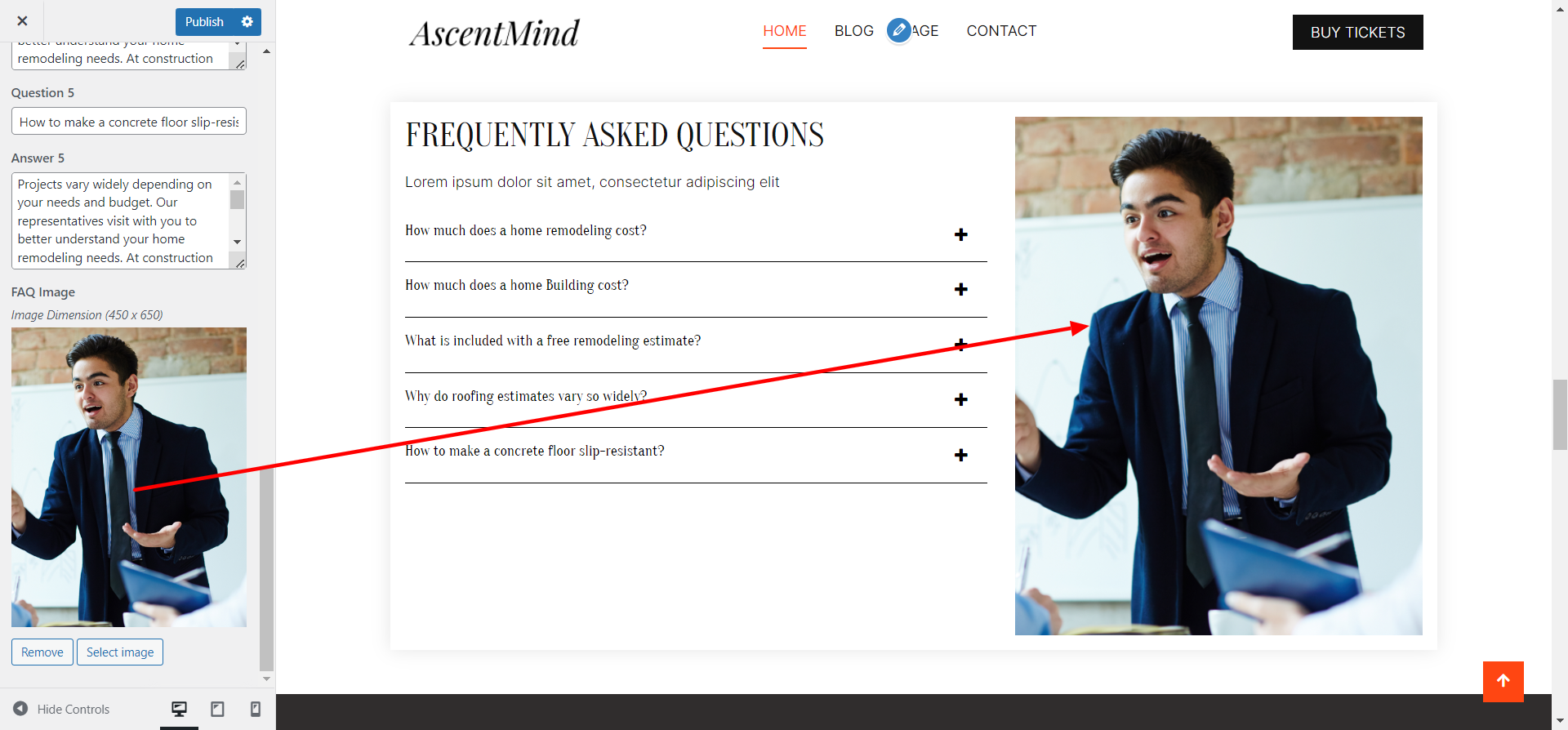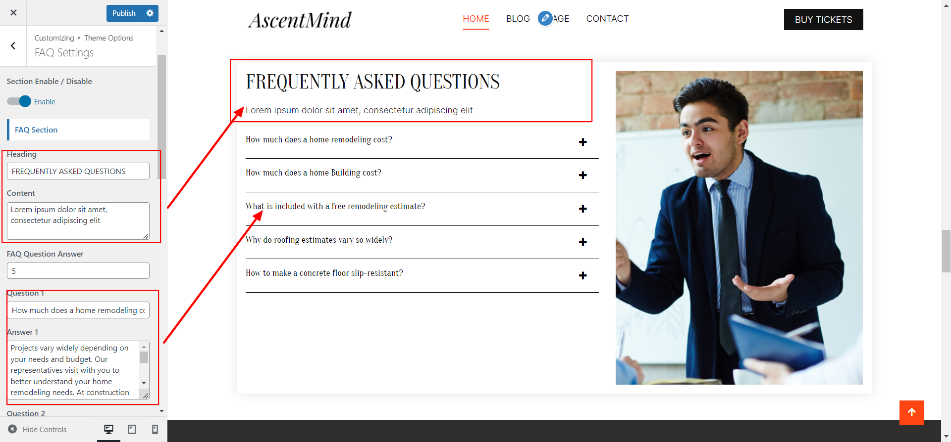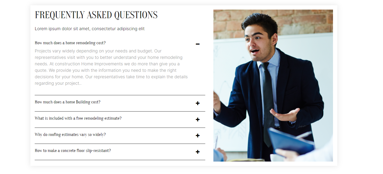 You can set sub heading, main heading and text for section. You can also set Counter Section the question and answer for each FAQ settings