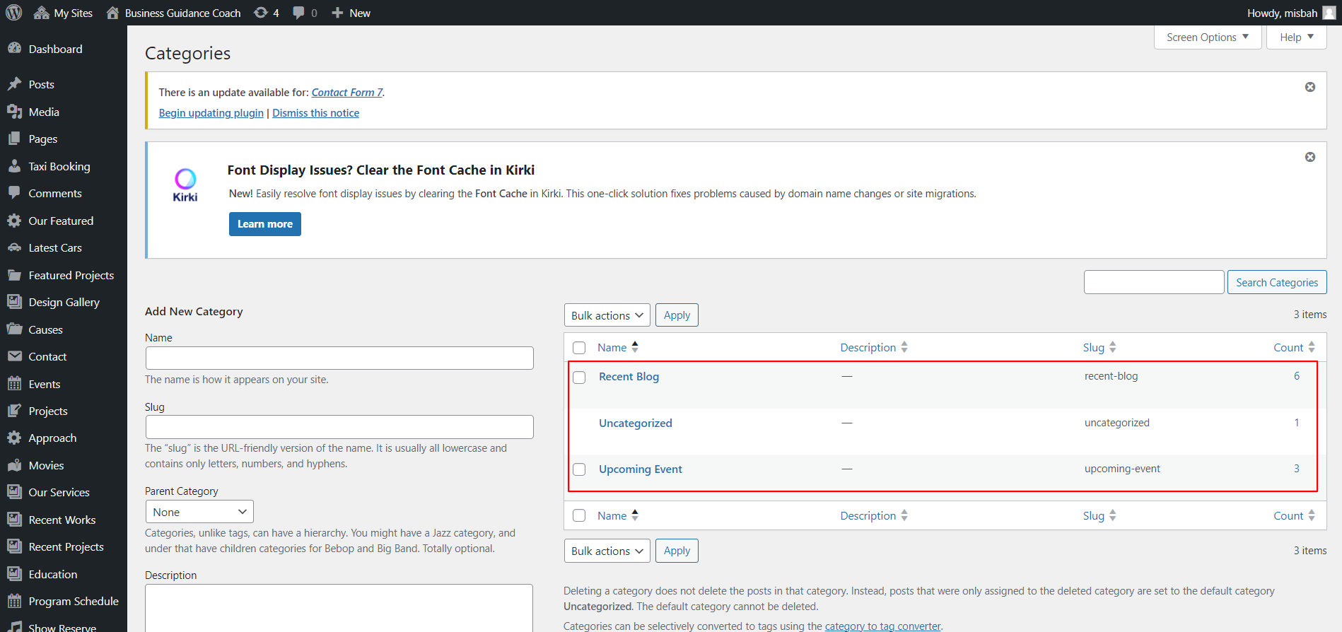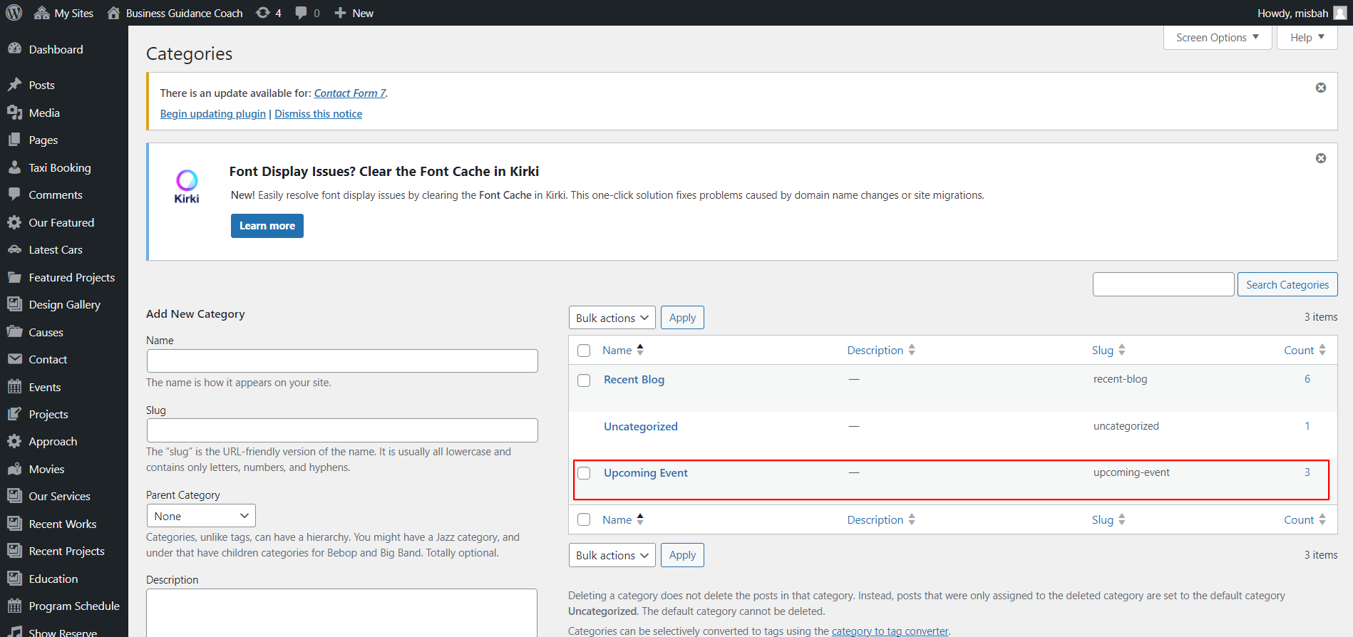 In the Dashboard, go to Up Coming Events >> Categories >> Add New