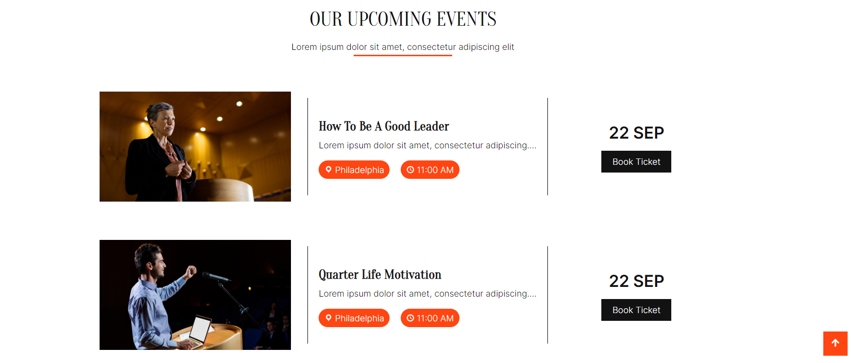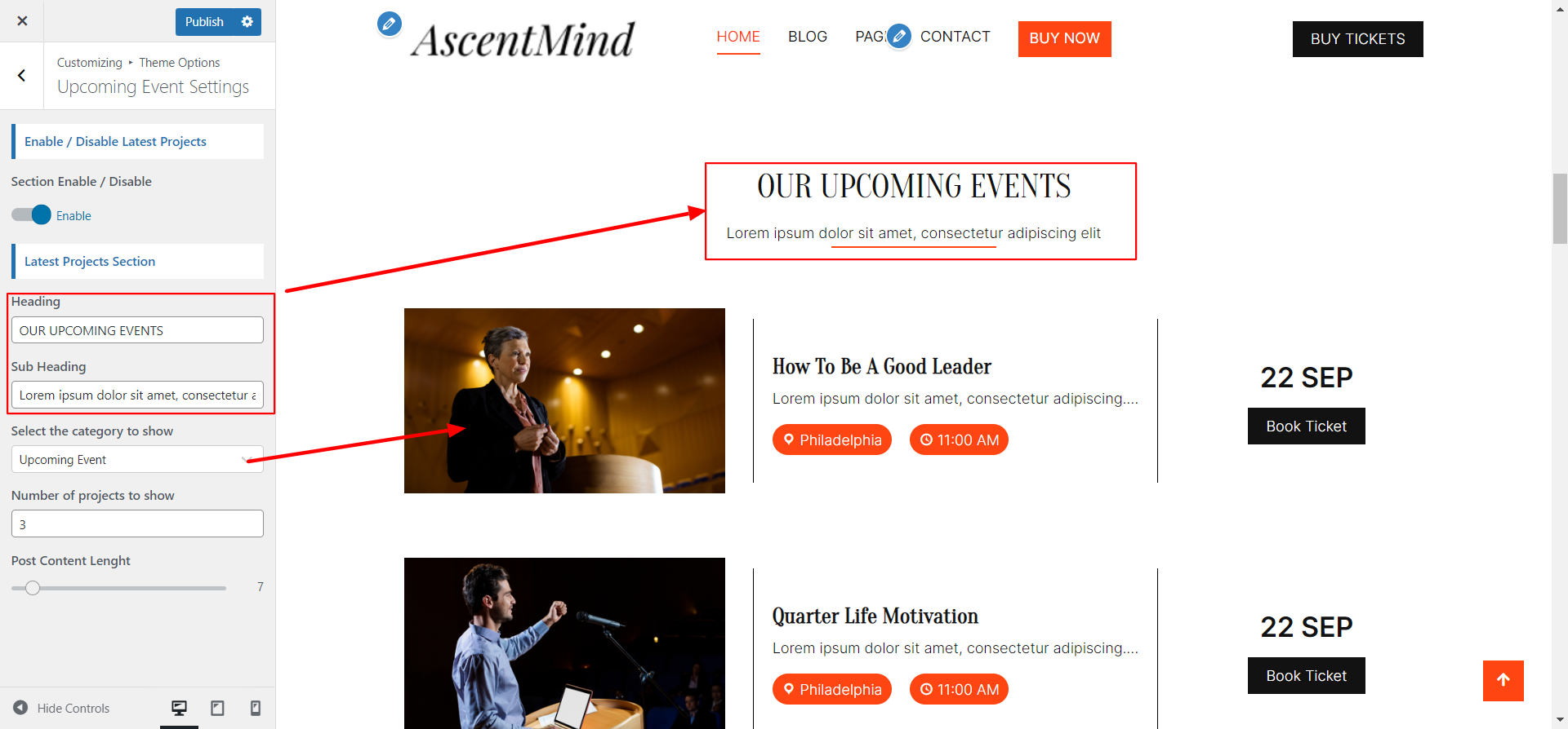 You can set heading and sub heading for section. You can choose from this options for each Up Coming Events settings.
