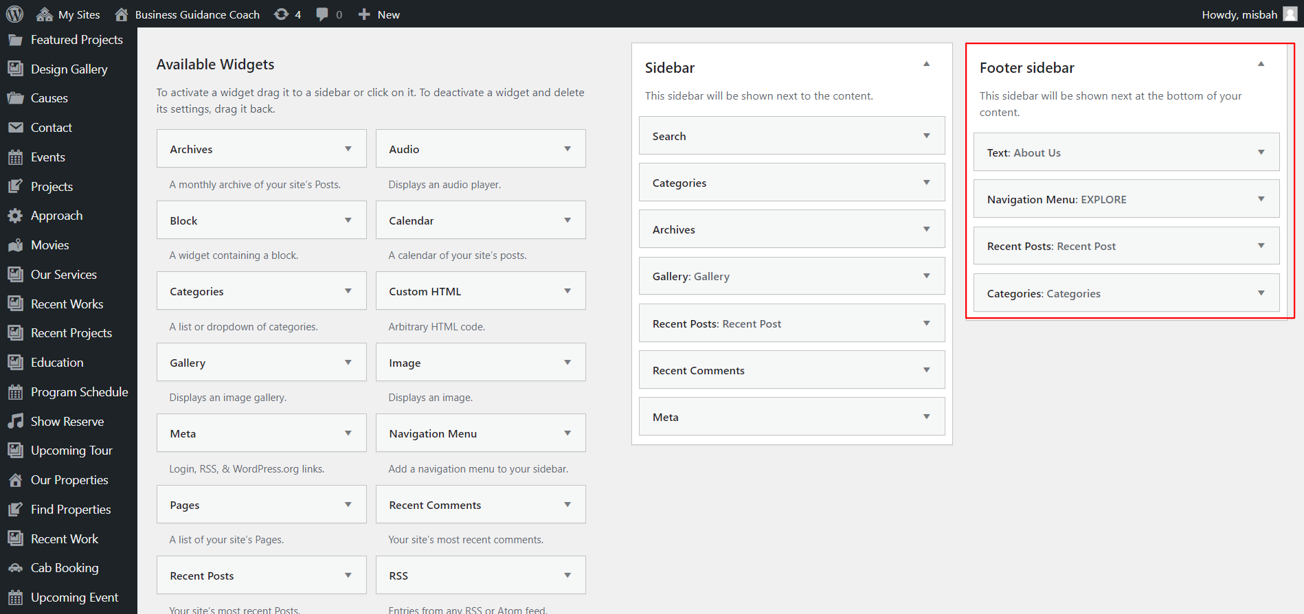 2. In the Dashboard, go to Appearance >> Widgets >> Footer Sidebar