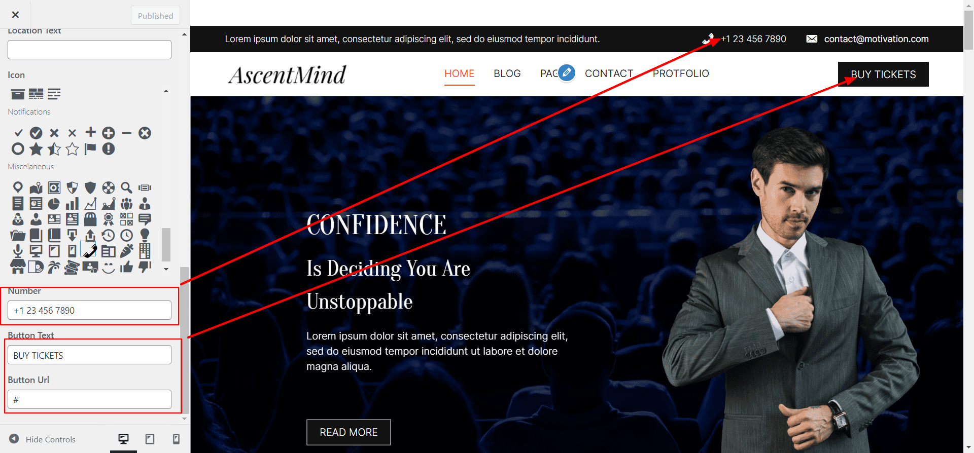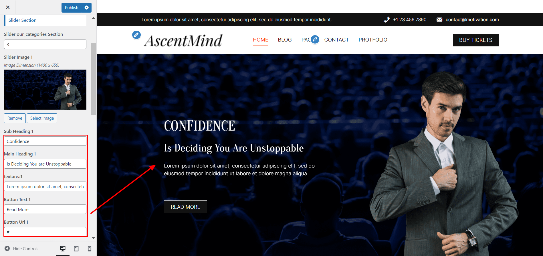 Select number slides to show. You can set heading, content, icon, button text and button url. You can choose from this options for each slider option.