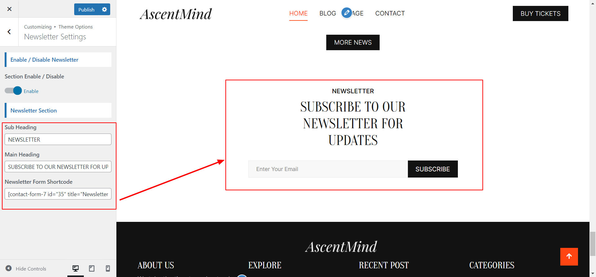 You can set sub heading main heading and background image and Newsletter Form Shortcode for section. You can also set the icon for each Newsletter settings