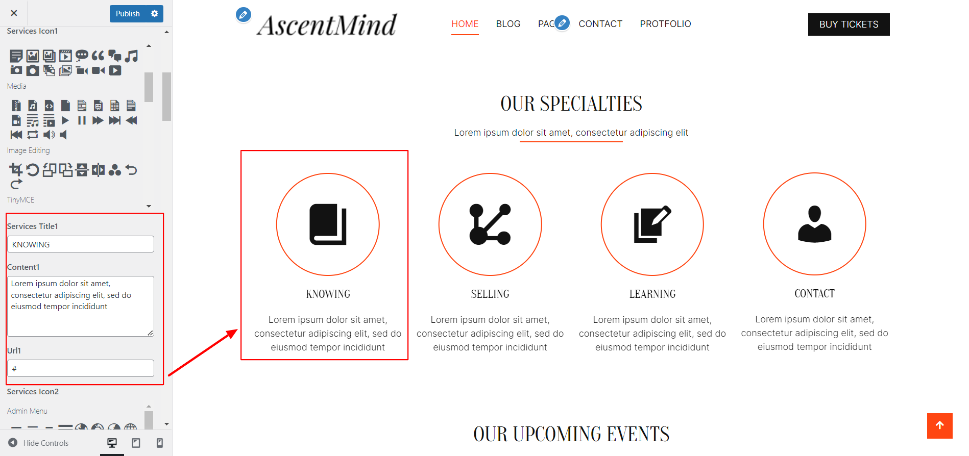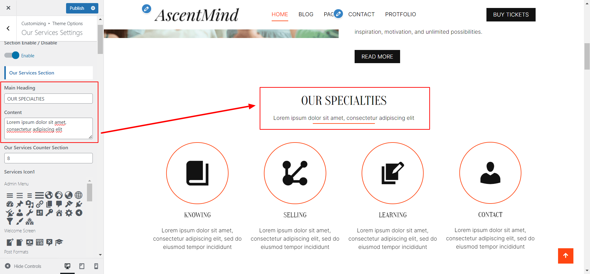 In the Dashboard, go to Appearance >> Customize >> Theme Options >> Our Specialties or Services Settings