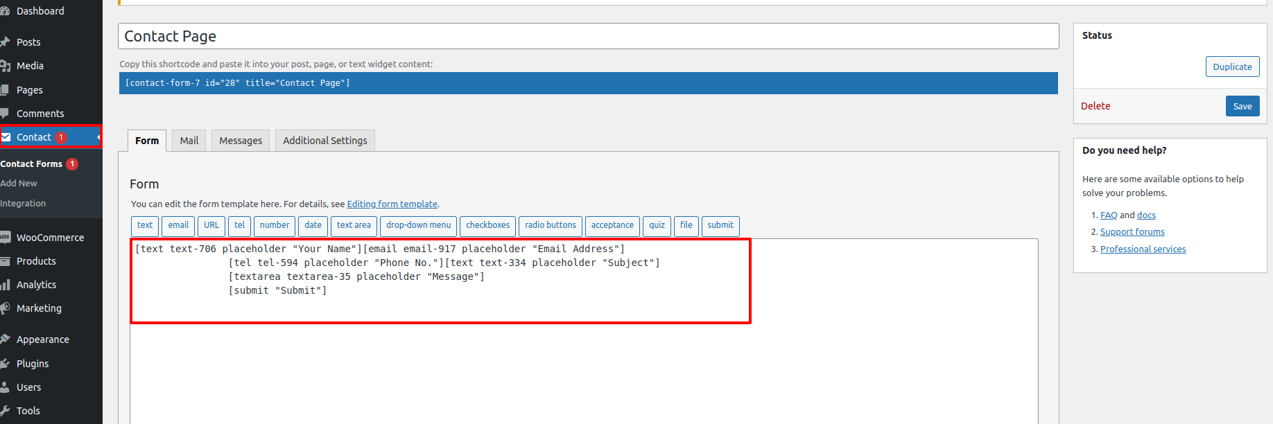 Give this new contact form a name and then scroll to Form. From this page, you can edit the contact form template.