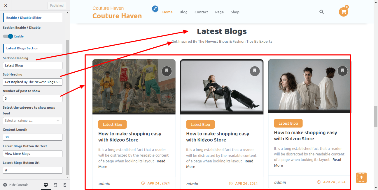 In the Dashboard, go to Appearance >> Customize >> Theme Options >> Latest Post Section