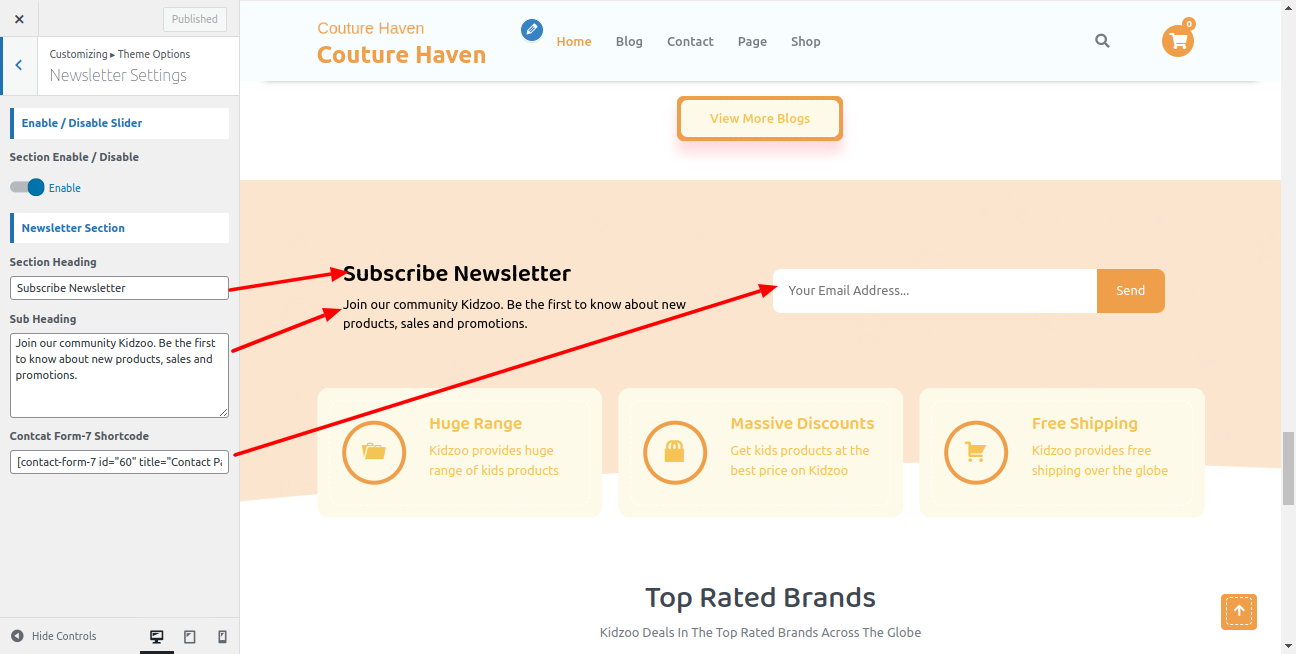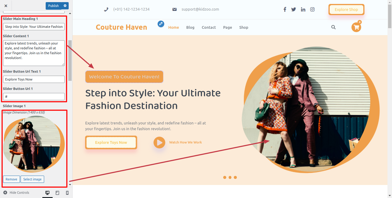 To configure the Theme Slider Settings, you have the following options for each slider:Set the heading and content for each slide.Set the button text for slider section.