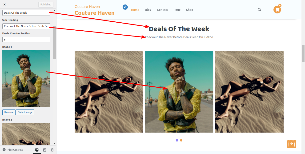 You can set the main heading for this section. Select theDeal of fishes to view. For each service, you can set the image, title, and url. You have the following options to configure for each Deal setting