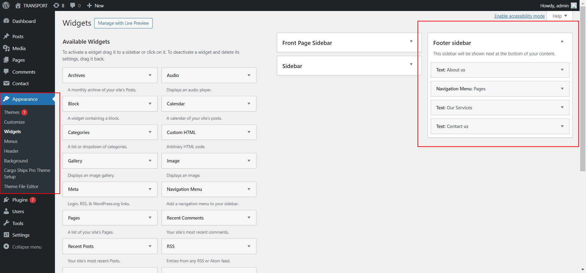 Navigate here and follow the instructions below to manage the footer's content and add some widgets.