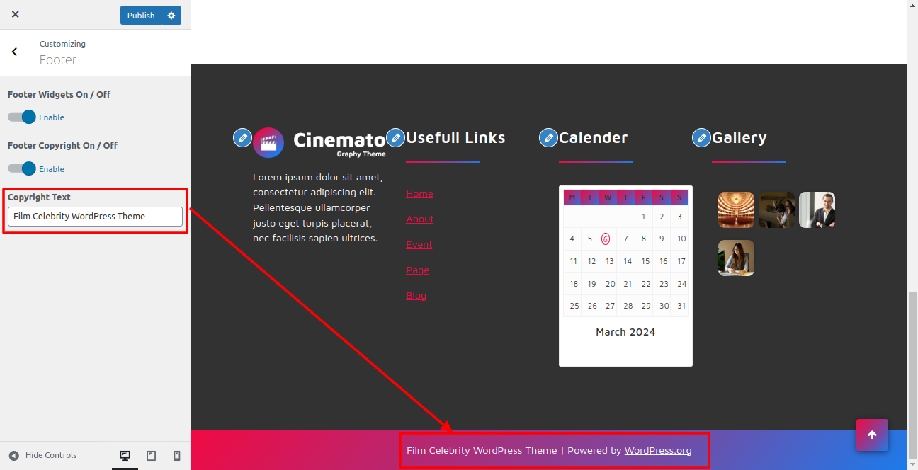5. In the dashboard, visit Appearance -- Customize -- Footer