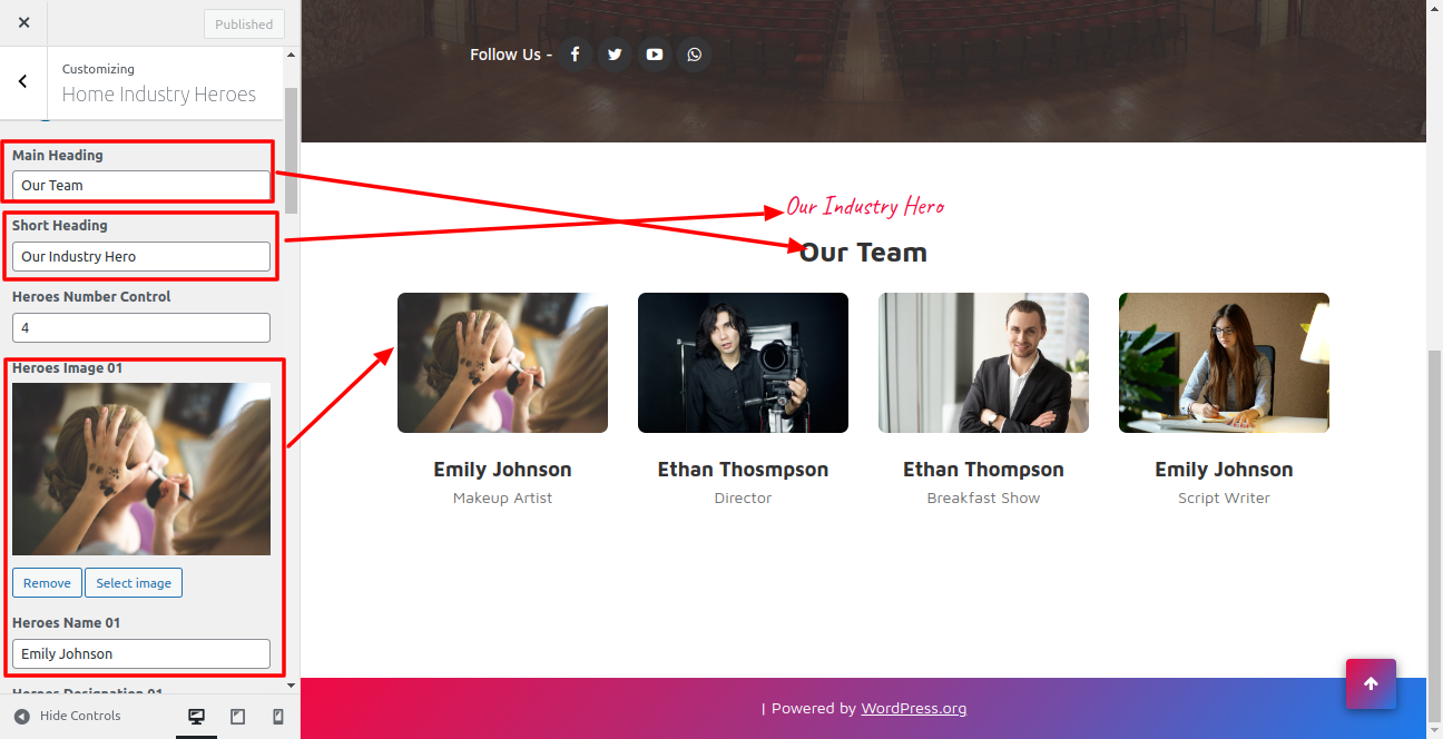 In the dashboard, visit Appearance -- Customize -- Home Industry Heroes