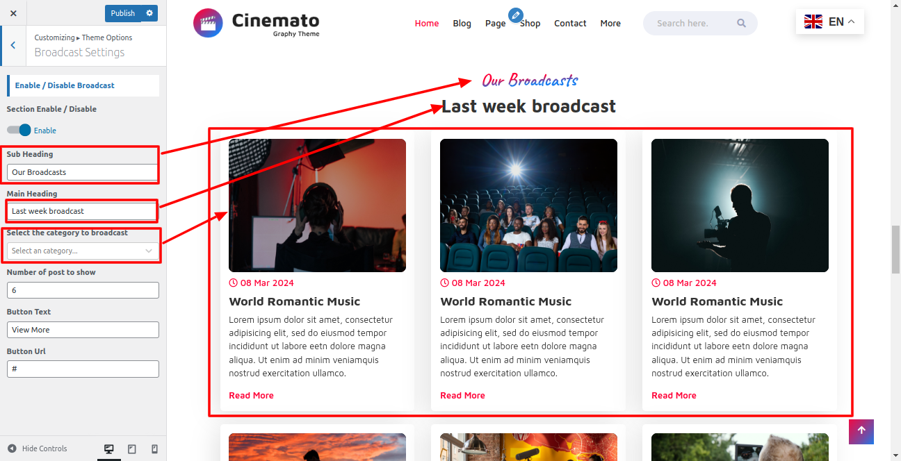In the Dashboard, go to Appearance >> Customize >> Theme Options >> Broadcast Section