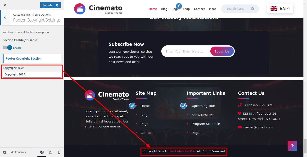 You can fill out the copyright content to footer copyright settings to continue with the footer settings.
