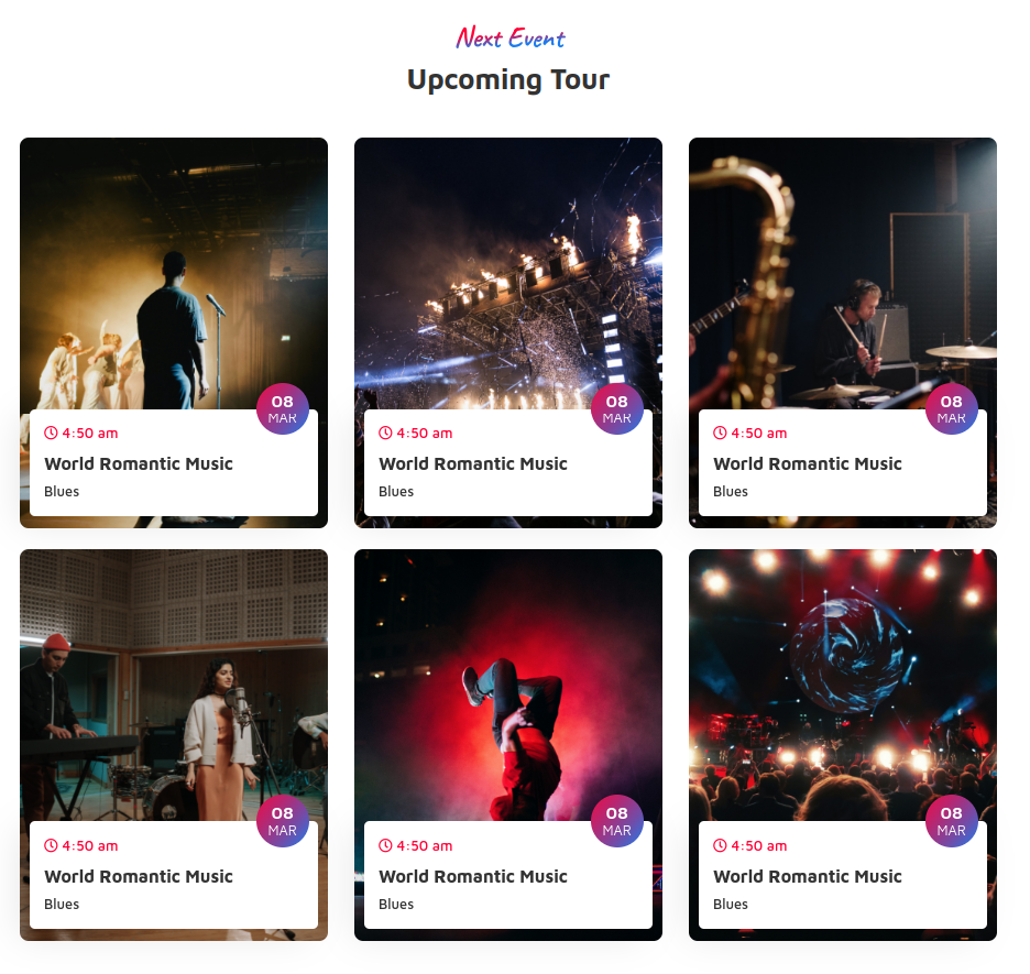 You can set Select the Upcoming Tour counter of images posts to view. For each Upcoming Tour, you can set the images and text. You have the following options to configure for each Upcoming Tour setting