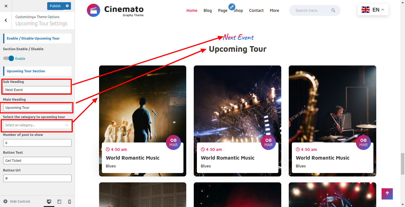 In the Dashboard, go to Appearance >> Customize >> Theme Options >> Upcoming Tour Settings