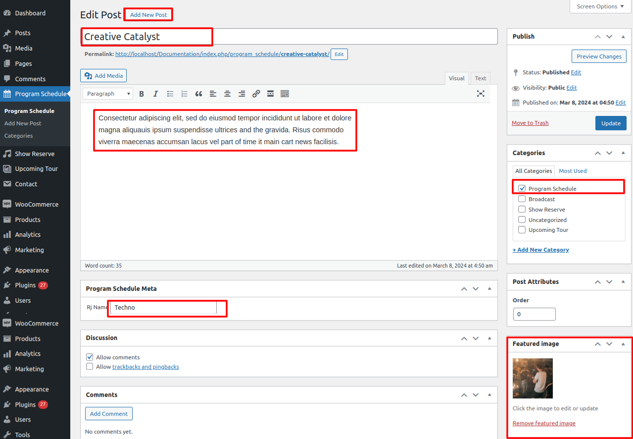Important Step:- Film Celebrity Pro Custom Posttype plugin is necessary for creating a Shedule Settings.In the Dashboard, go to Prgram Shedule >> Add New Post