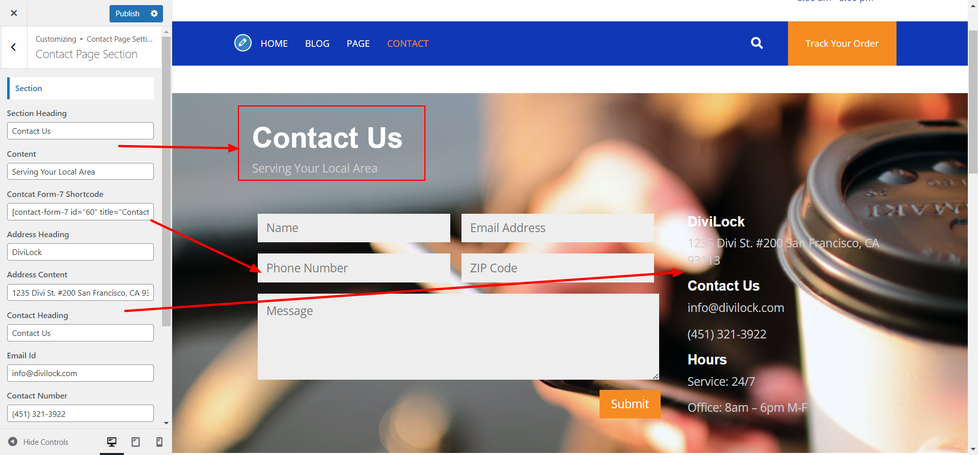 In the Dashboard, go to Appearance >> Customize >> Contact Page Settings >> Contact Page Section