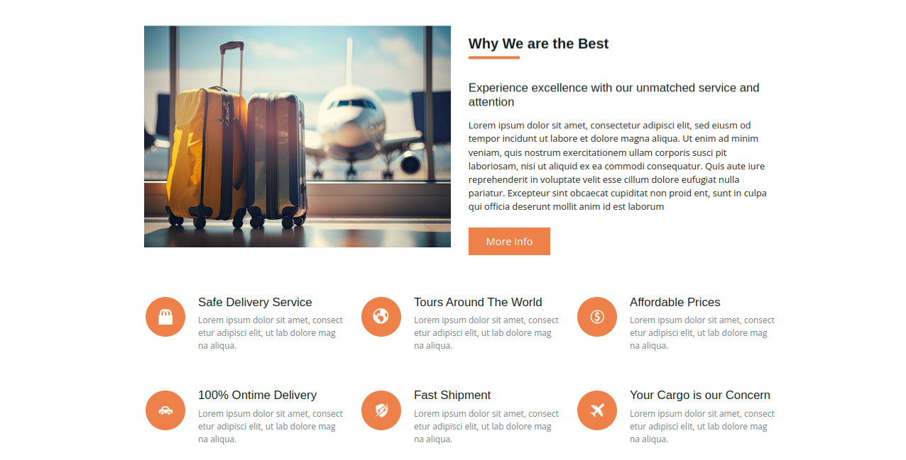 This page template's parameters (such as section content, graphics, and the number of posts they display) are configurable.