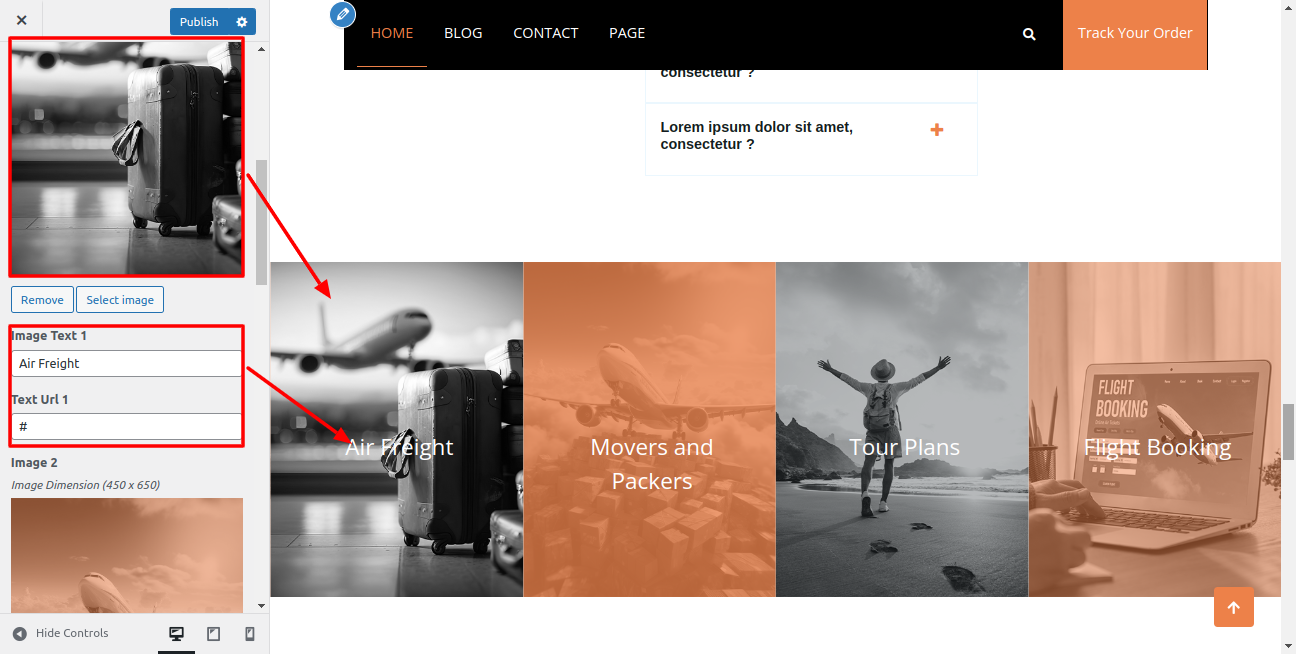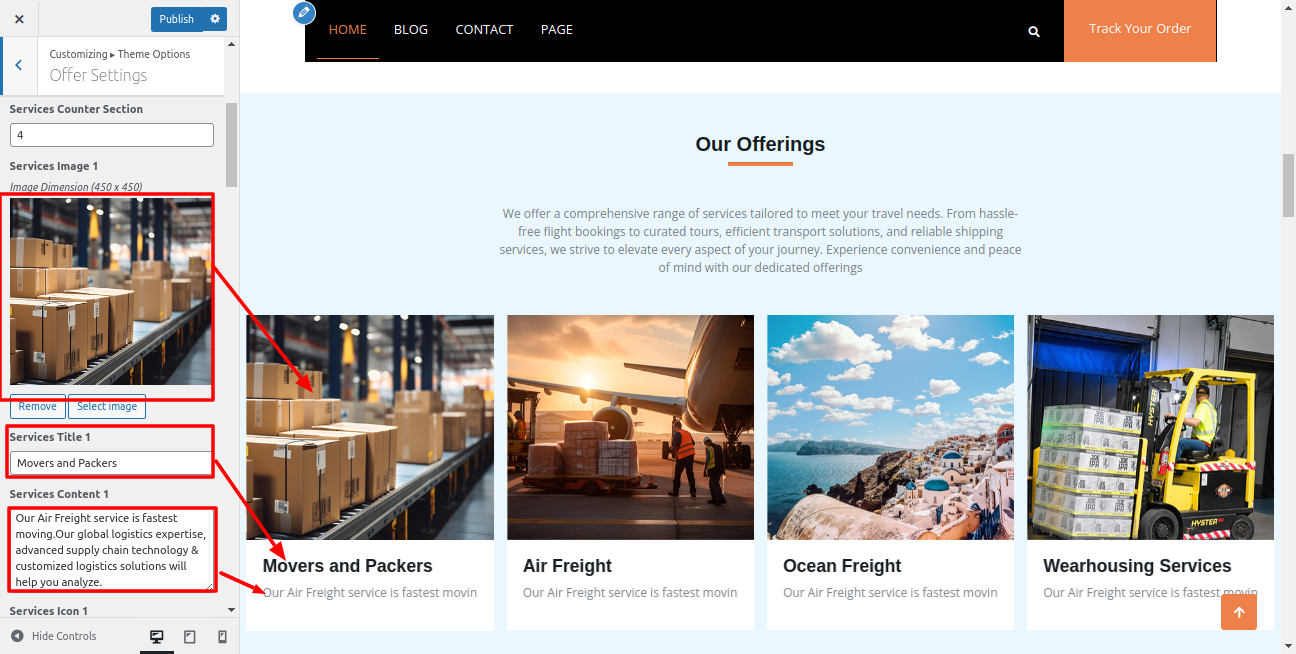 You can set the main heading for this section. Select the our services counter of Services posts to view. For each service, you can set the image, title, and url. You have the following options to configure for each service setting