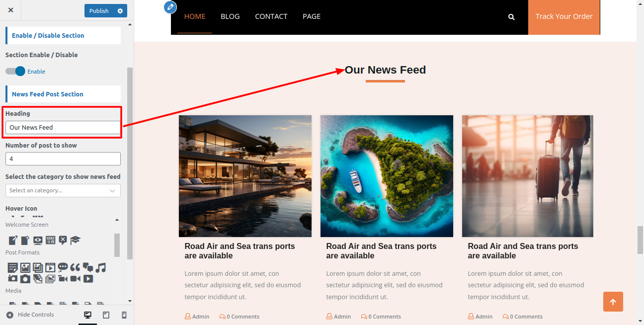 You can set the heading and content of the section. In the latest news settings, you have the following options to choose from.