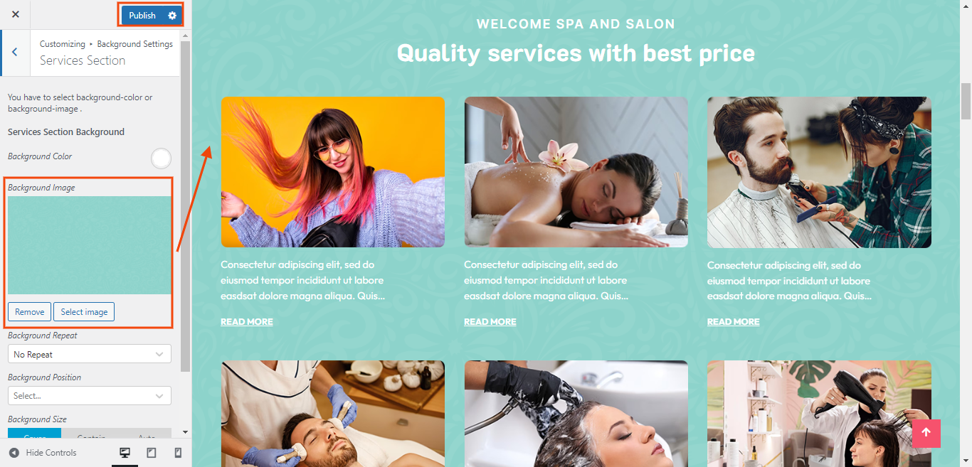 In the Dashboard, go to Appearance >> Customize >> Theme Options >> Background Settings >> Services Section