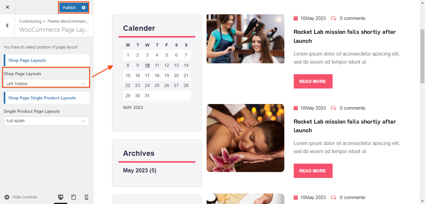In the Dashboard, go to Appearance >> Customize >> Theme WooCommerce Settings >> WooCommerce Page Layout