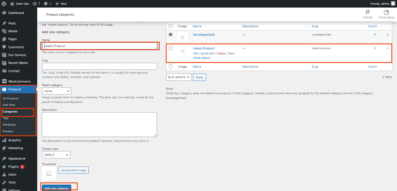This screen is divided into 2 sections, the Add New Category and category table sections.
