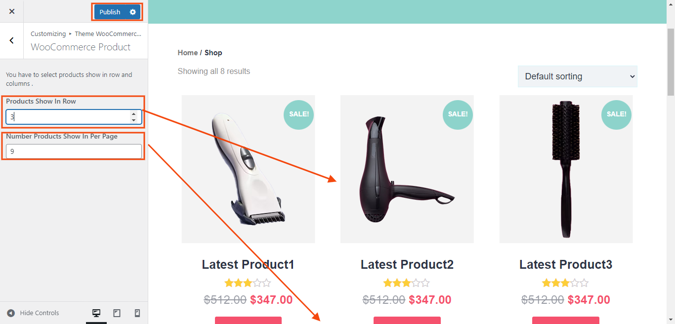 In the Dashboard, go to Appearance >> Customize >> Theme WooCommerce Settings >> WooCommerce Product