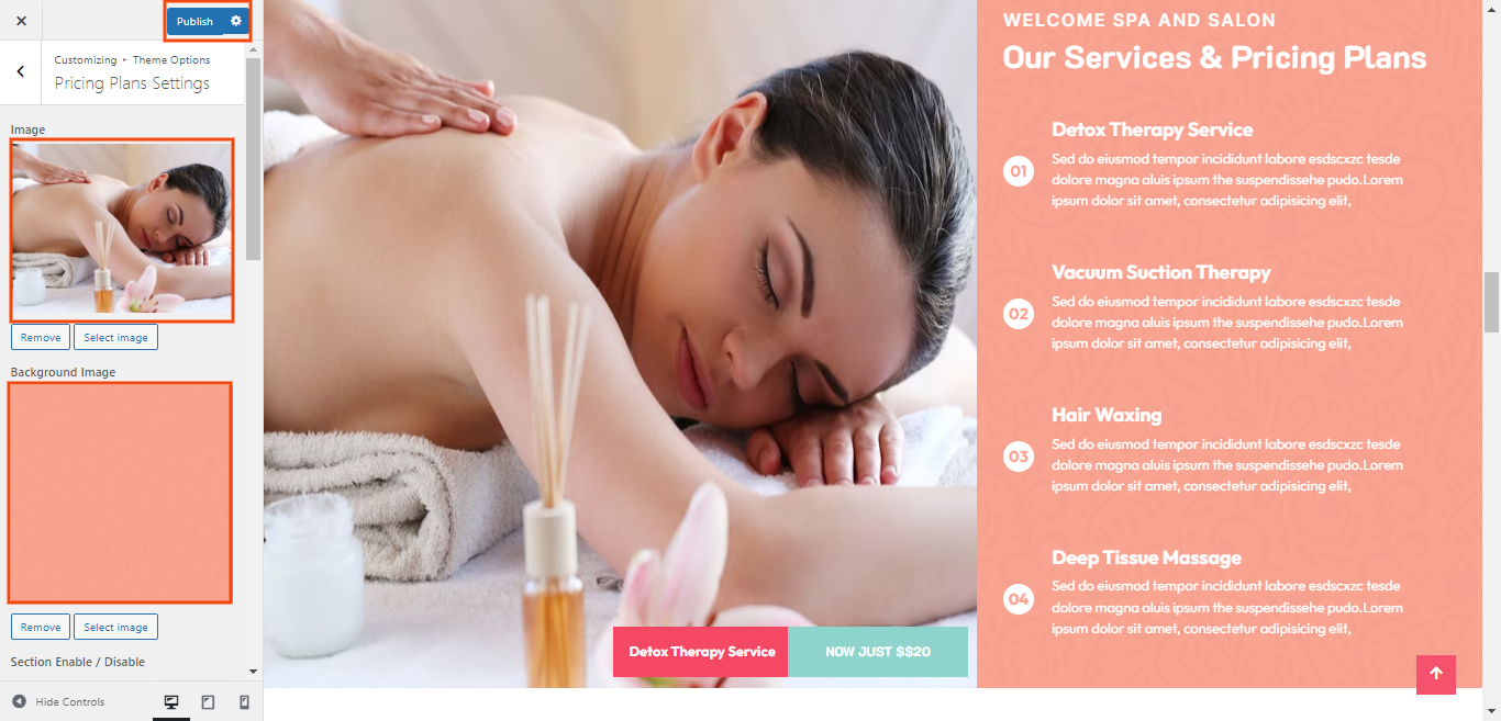 You can select number of tabs to show in section. You can select text of tab. You can select category to display Our Services choose from this options for each Best Popular Food settings.