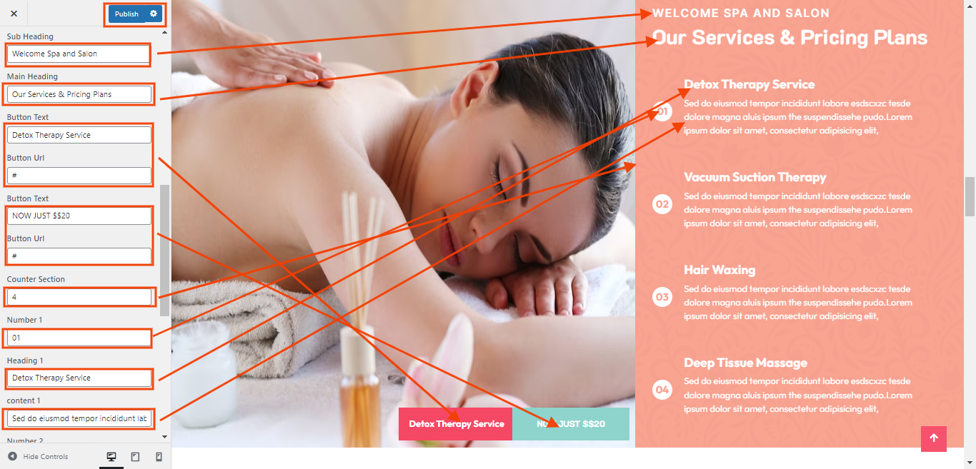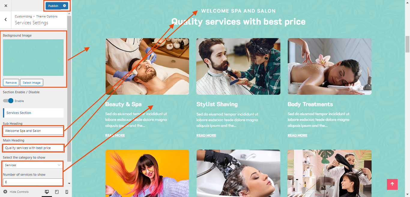 You can set heading and sub heading for section. You can choose from this options for each Services settings.