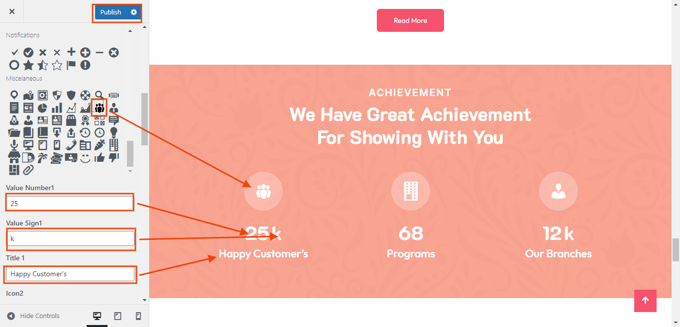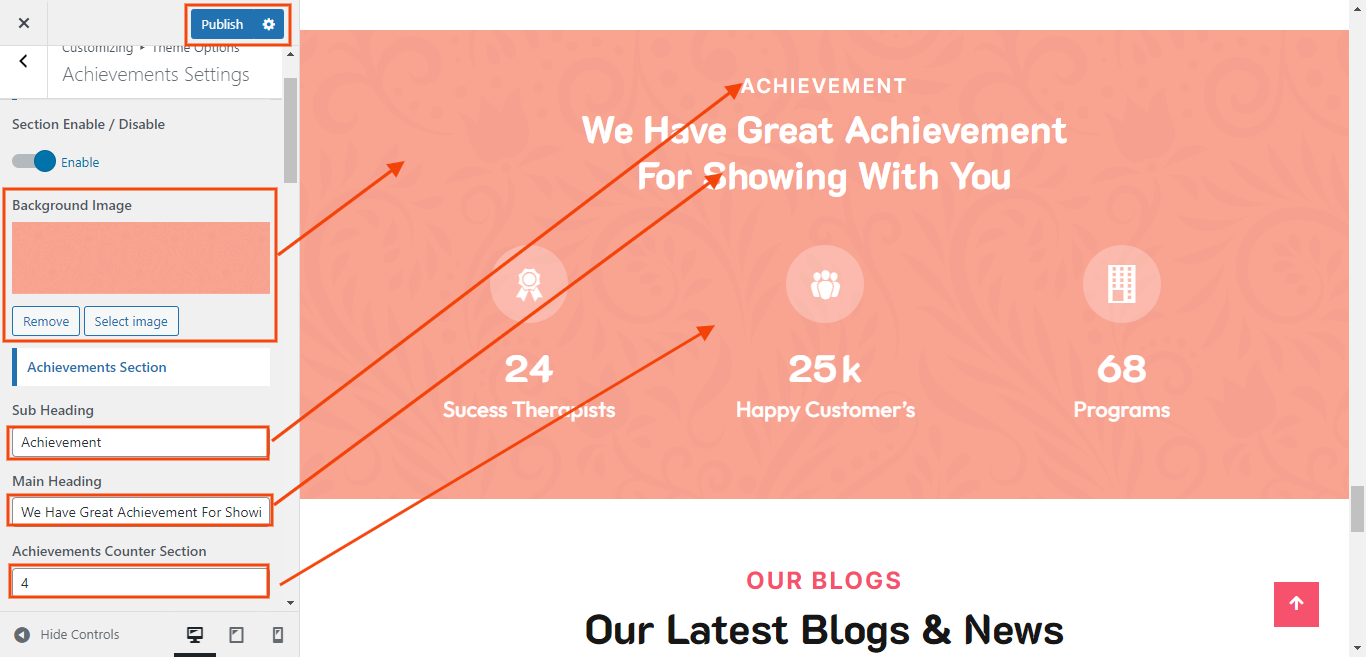 You can set sub heading main heading , heading , and price text and button section for each Achievements settings