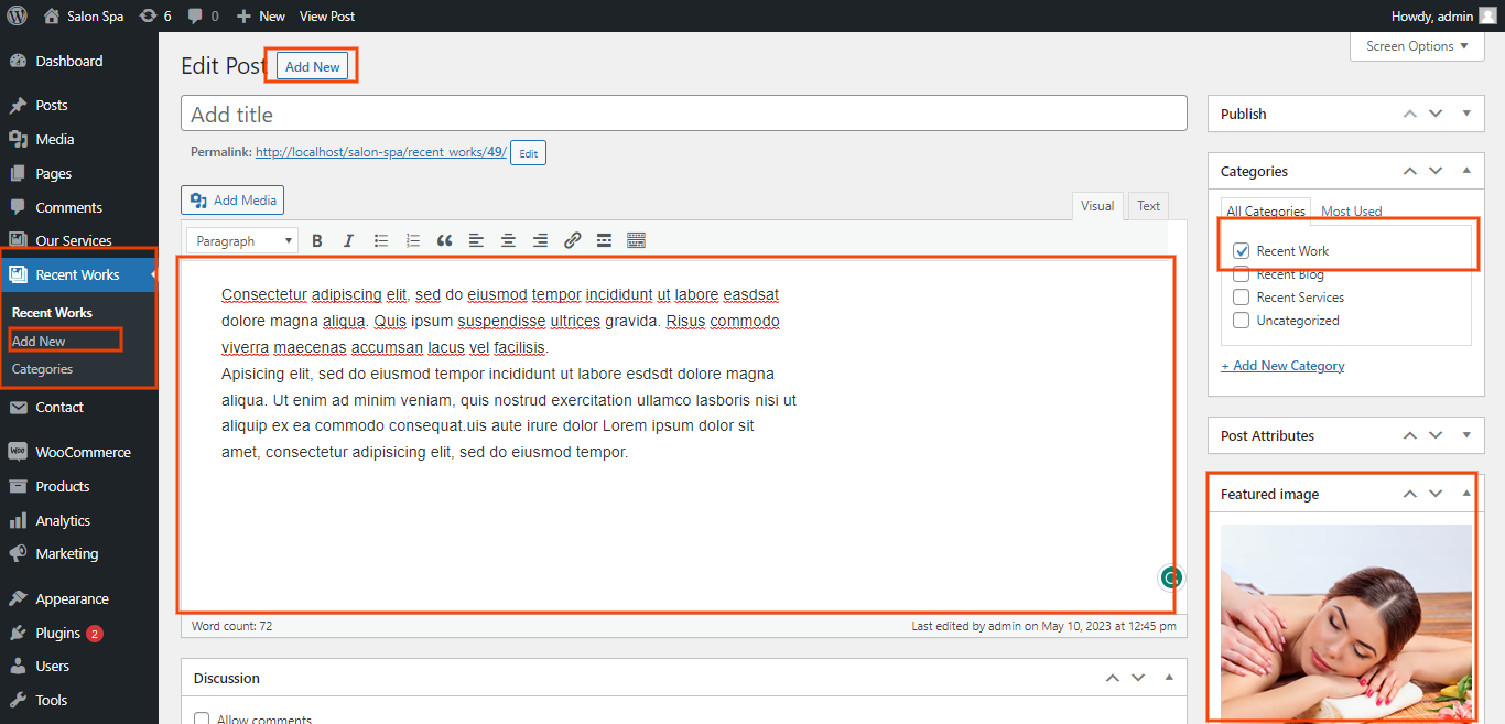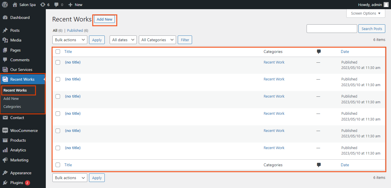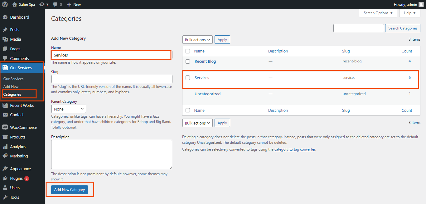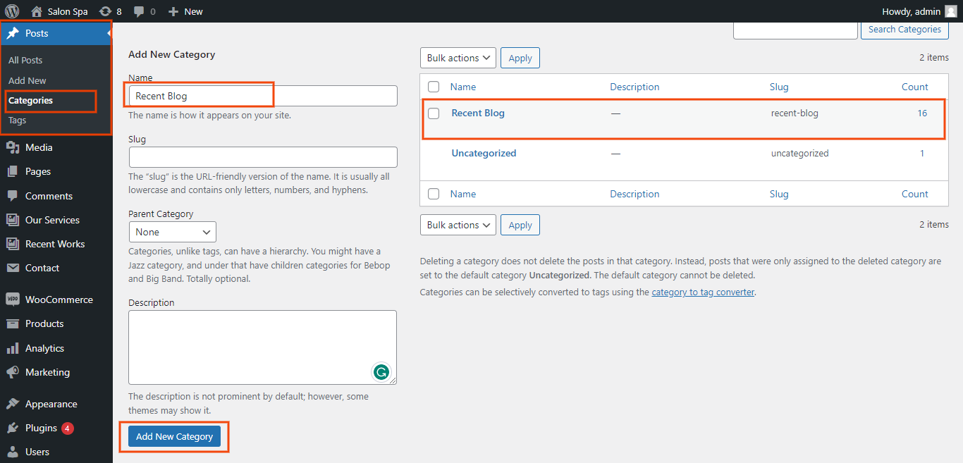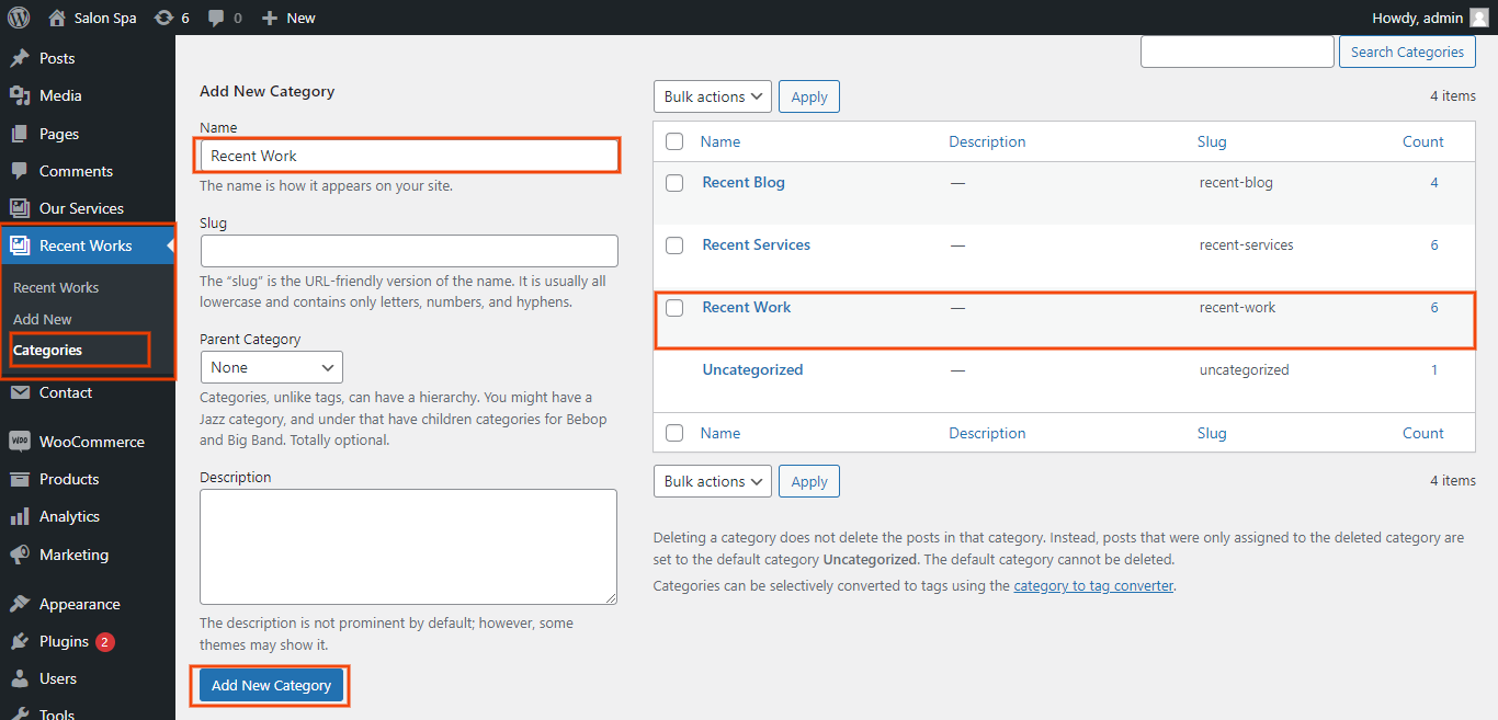 In the Dashboard, go to Recent Works >> Categories >> Add New