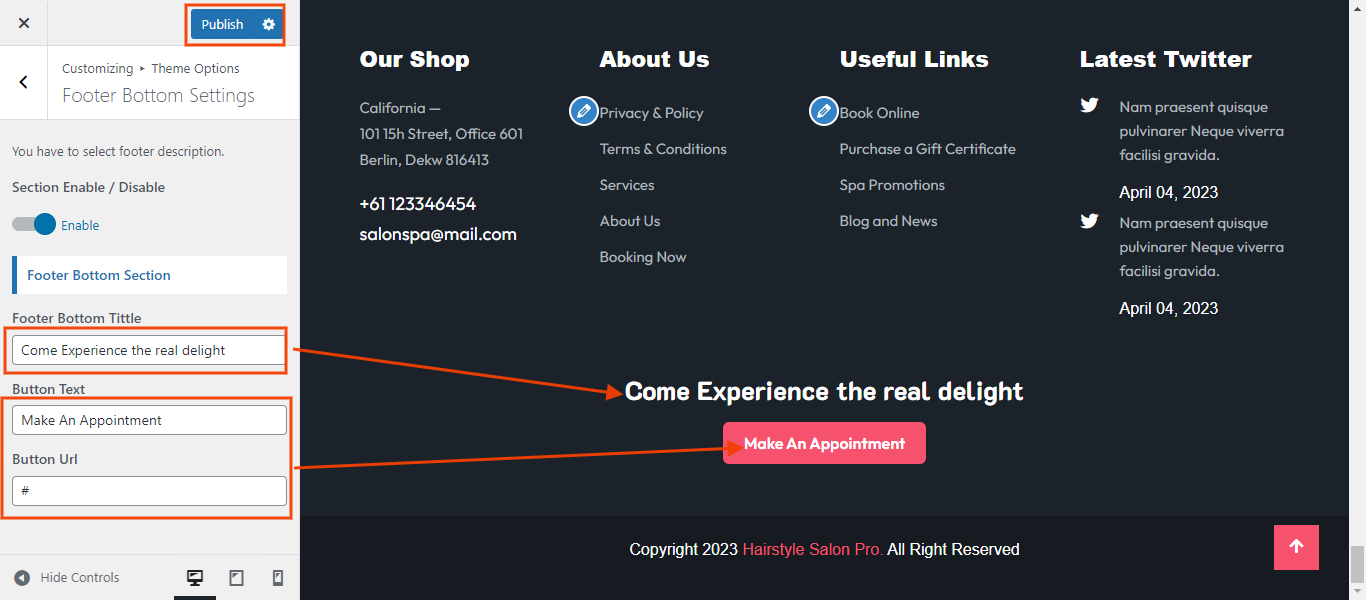 In order to proceed with footer Settings, You can also set footer title and button text. You can fill the Footer Bottom content to footer Footer Bottom Settings.