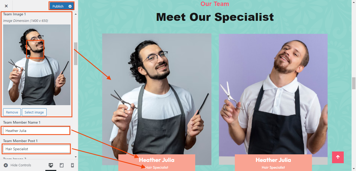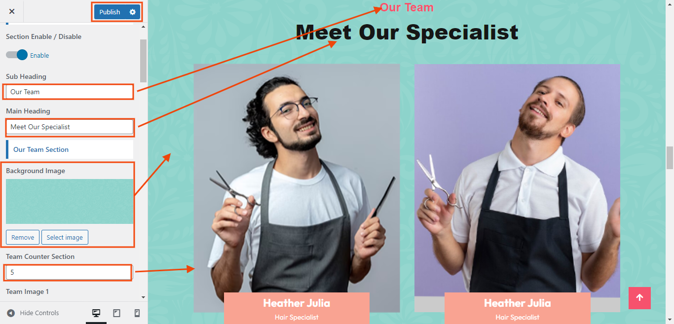 You can set sub heading main heading , background image and team counter section for each Our Team settings