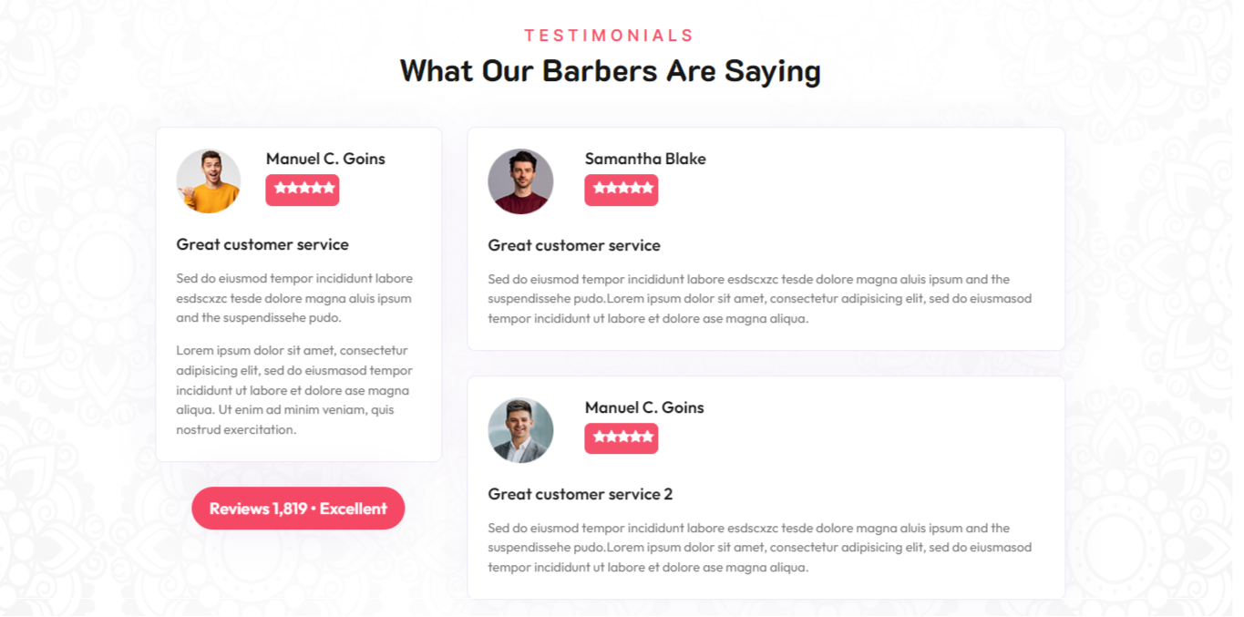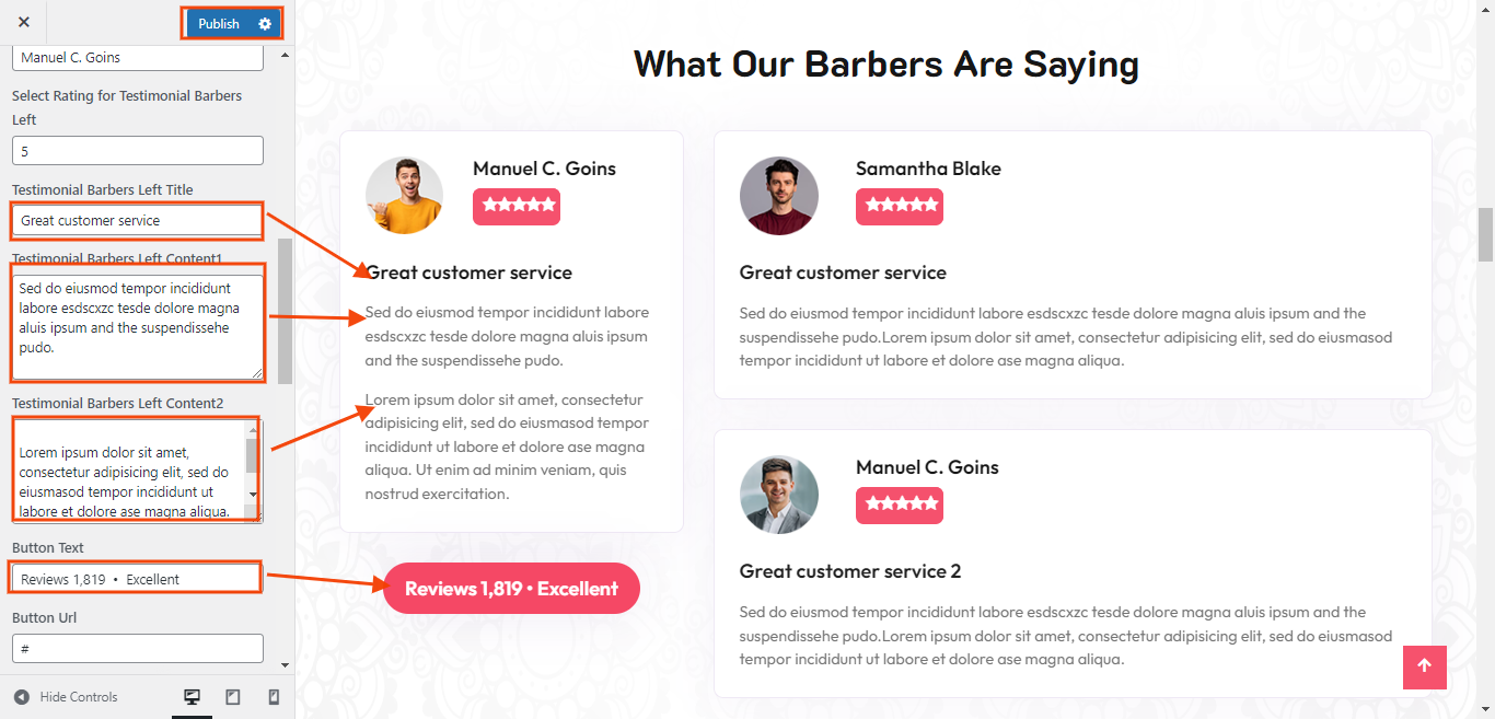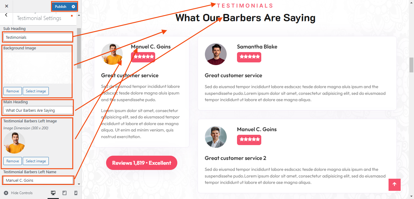 You can set sub heading, main heading and text for section. You can also set the image , review, and name, post for each testimonial settings