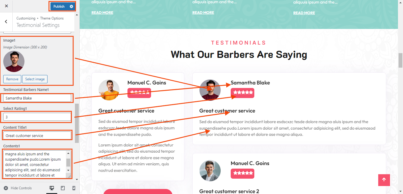 You can set main heading and text for section. You can also set the image , content and button text for each testimonial settings