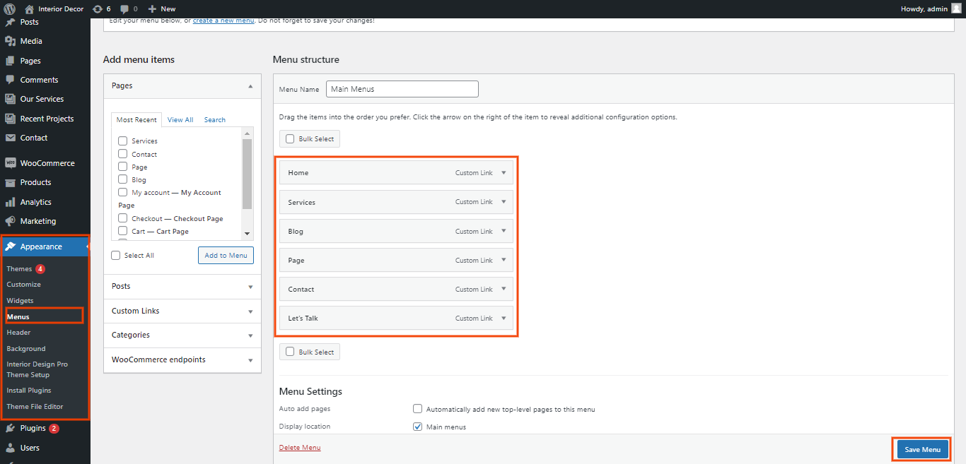 From the 'Appearance' menu on the left-hand side of the Dashboard, select the 'Menus' option to bring up the Menu Editor.
