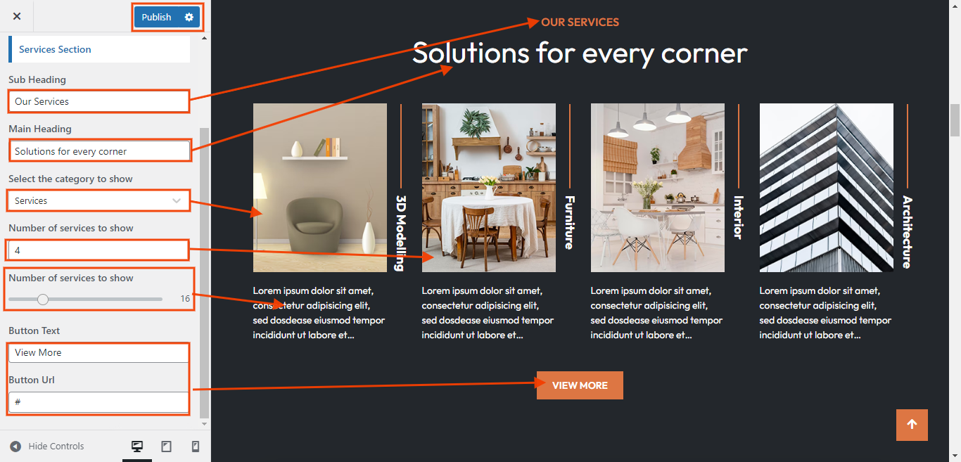 You can set heading and sub heading for section. You can choose from this options for each Services settings.
