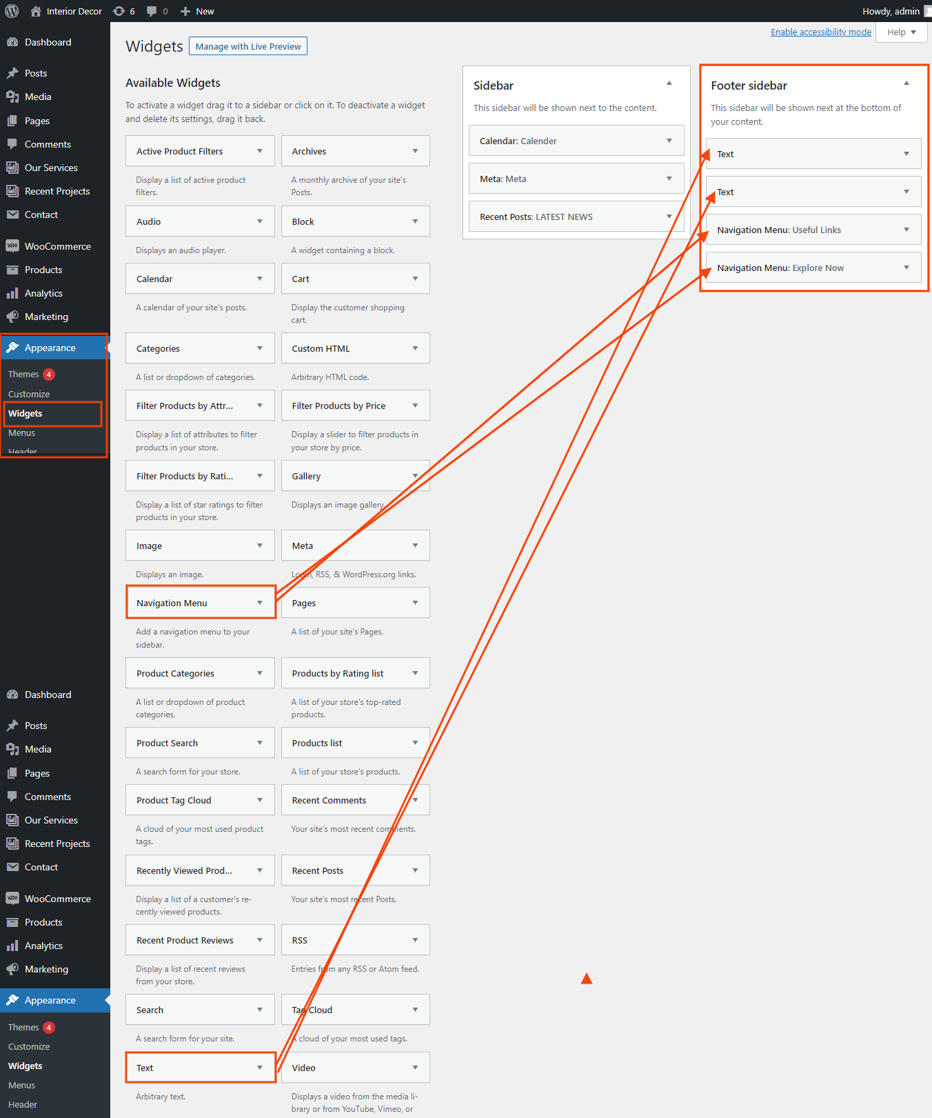 In order to manage content for footer and add some widgets, navigate to, follow the instructions given below.