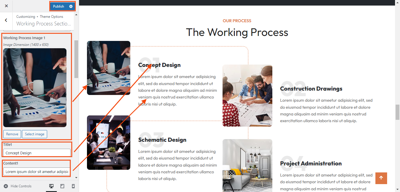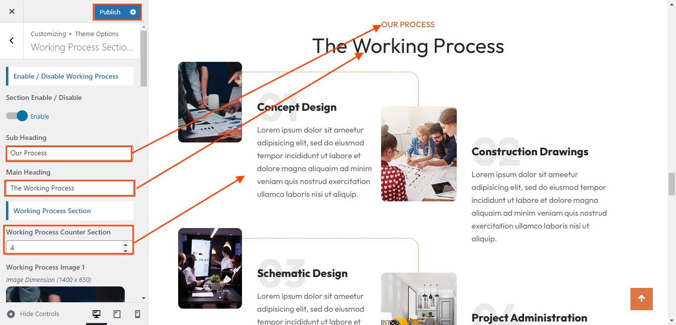 In the Dashboard, go to Appearance >> Customize >> Theme Options >> Working Process Settings