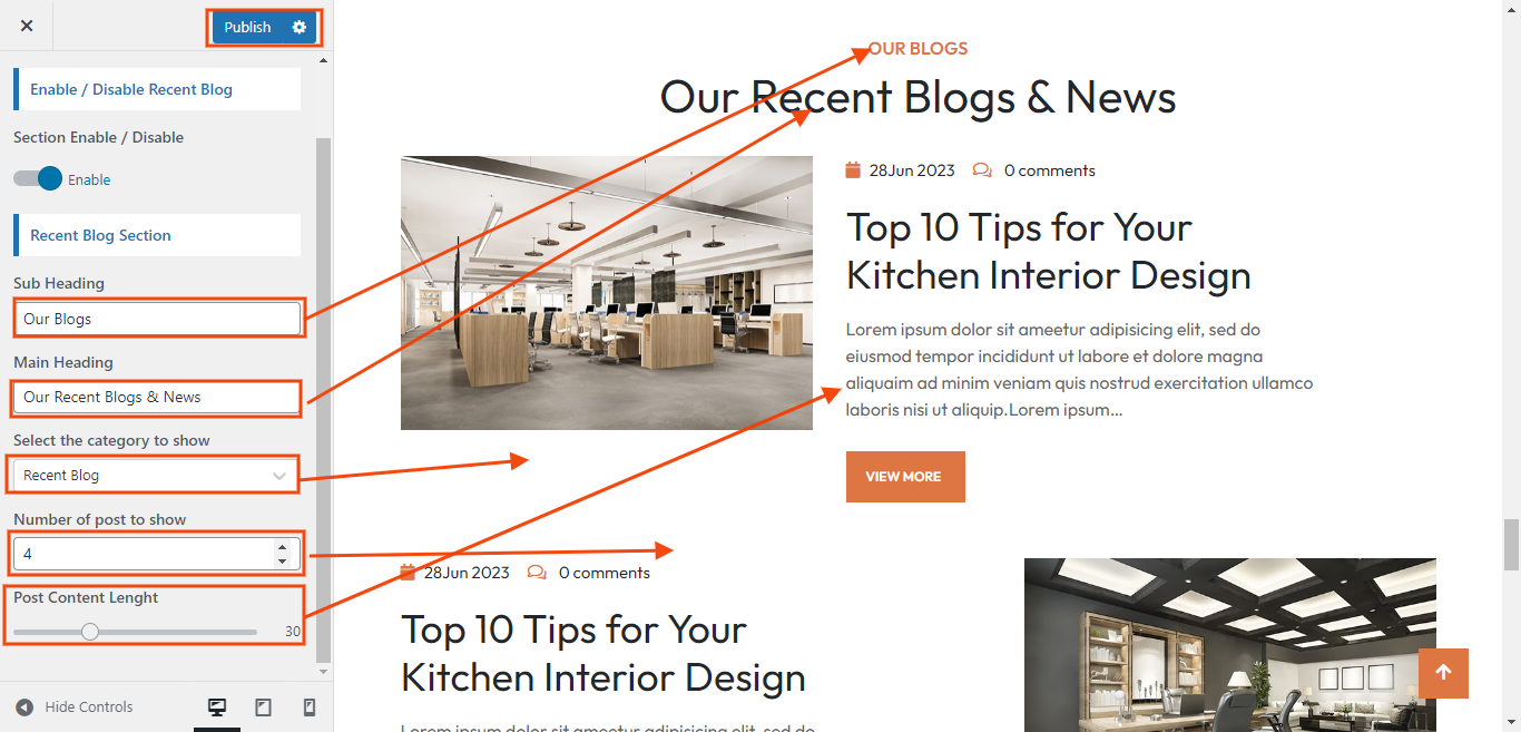 You can set heading and content of section. You can choose from this options in Recent Blog settings.
