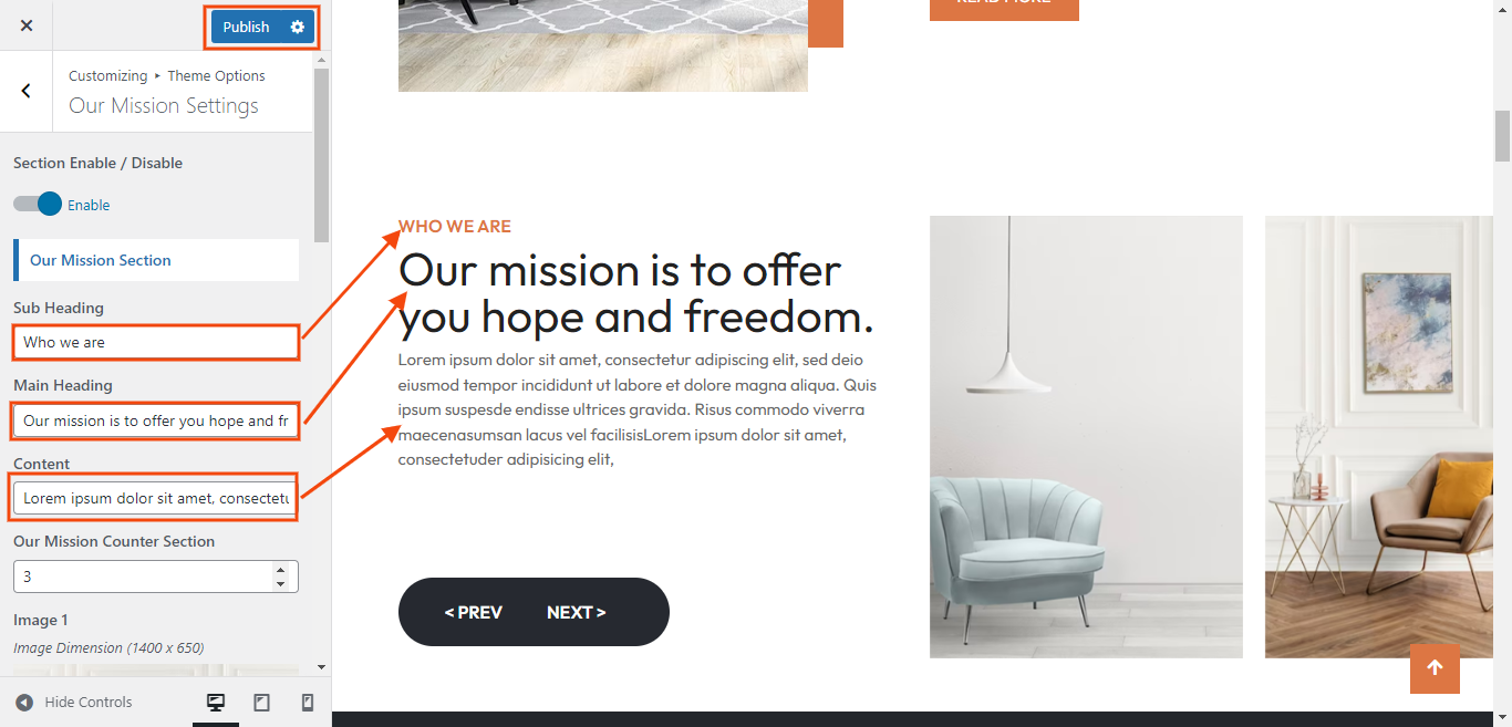 In the Dashboard, go to Appearance >> Customize >> Theme Options >> Our Mission Settings