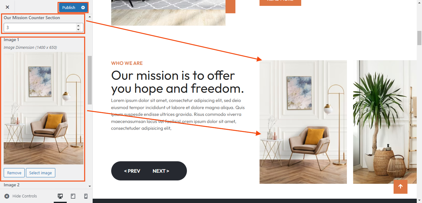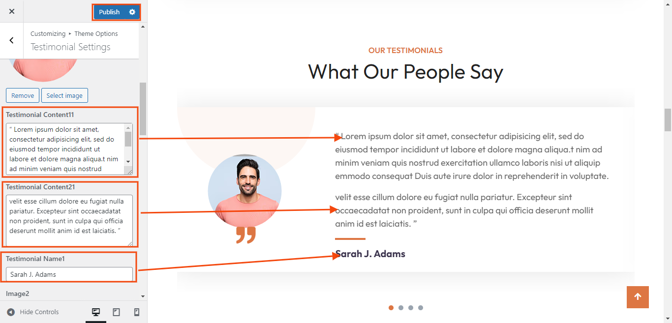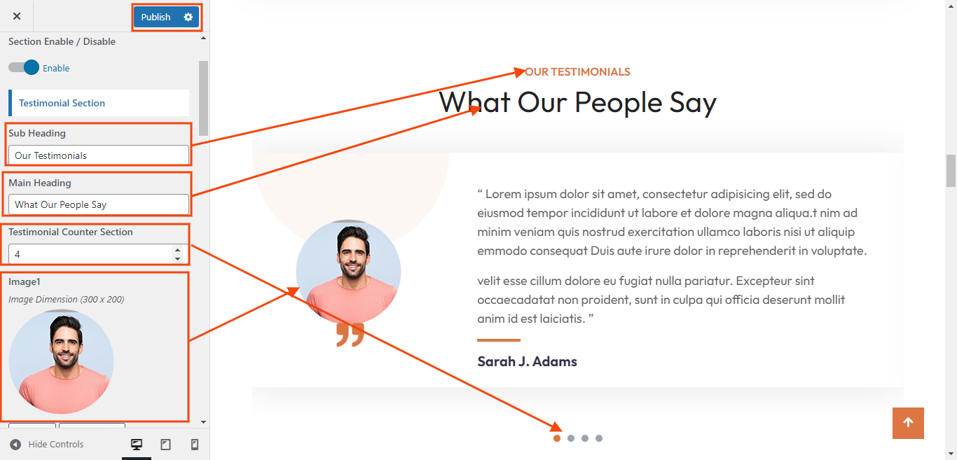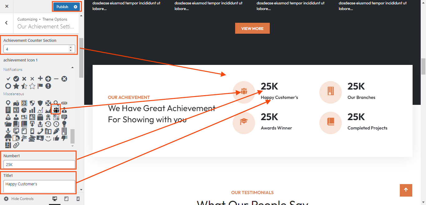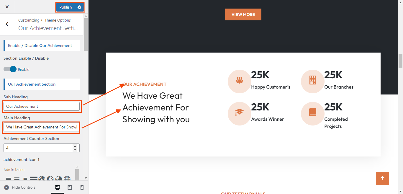 You can set sub heading, main heading and text for section. You can also set Counter Section the image for each testimonial settings