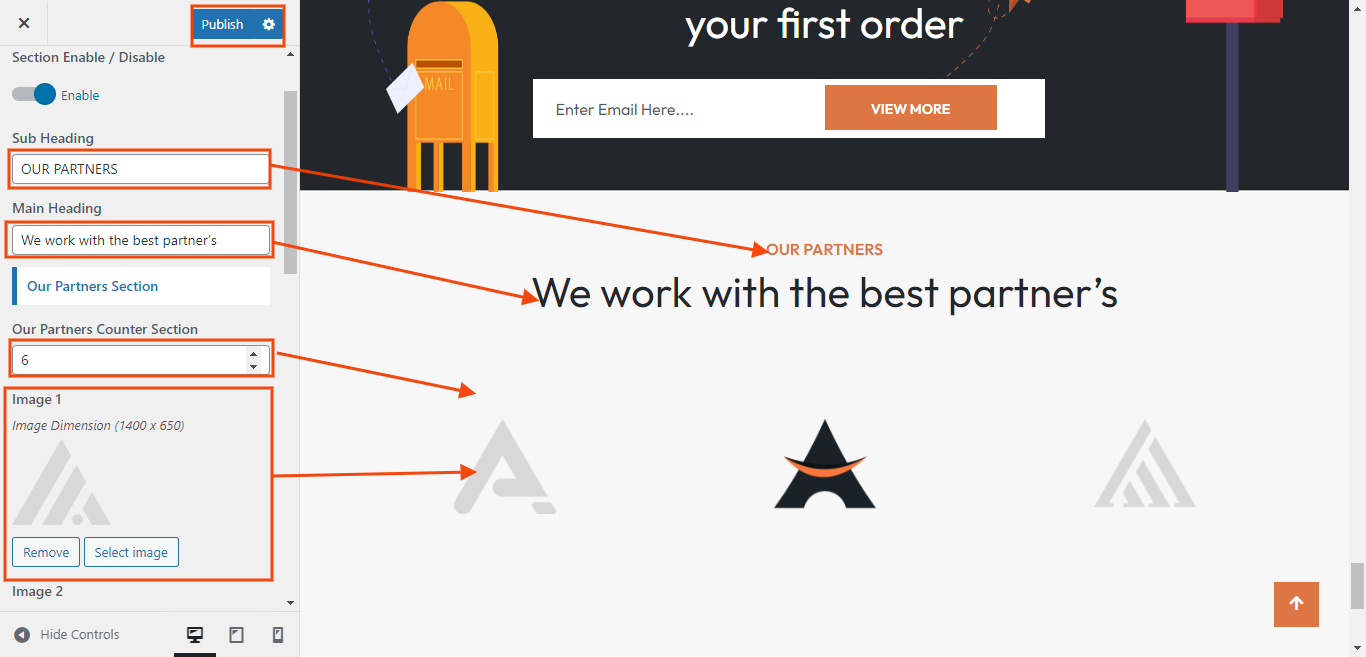You can set sub heading main heading and our partners Counter section set image for this section.