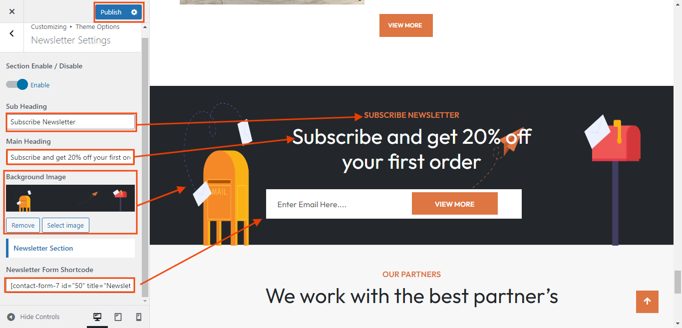 You can set sub heading main heading and background image and Newsletter Form Shortcode for section. You can also set the icon for each Newsletter settings