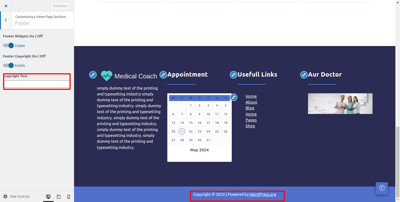 5. In the dashboard, visit Appearance -- Customize -- Footer