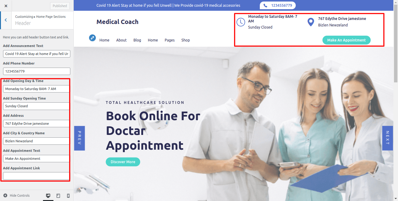 You can set Header conatct number, email address and location. You can button text and button url.