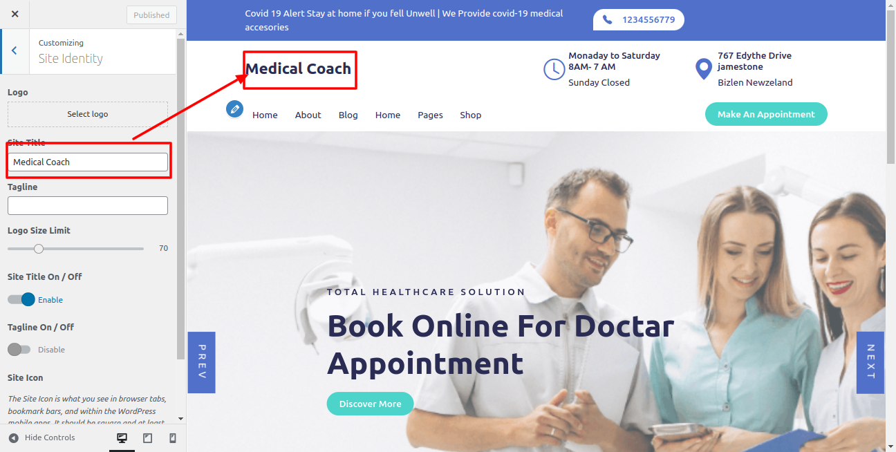 Proceed with Theme Logo setup, you can set site title and tagline, proceed as described below.